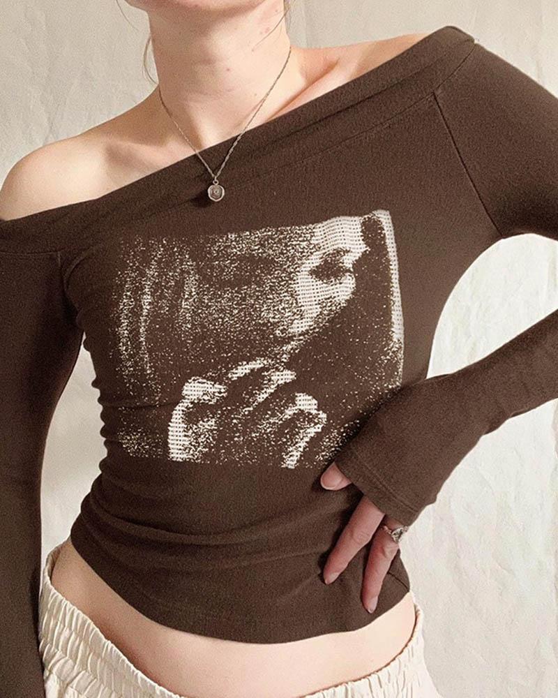 Details: Off-shoulder long-sleeve T-shirt with front human face print design