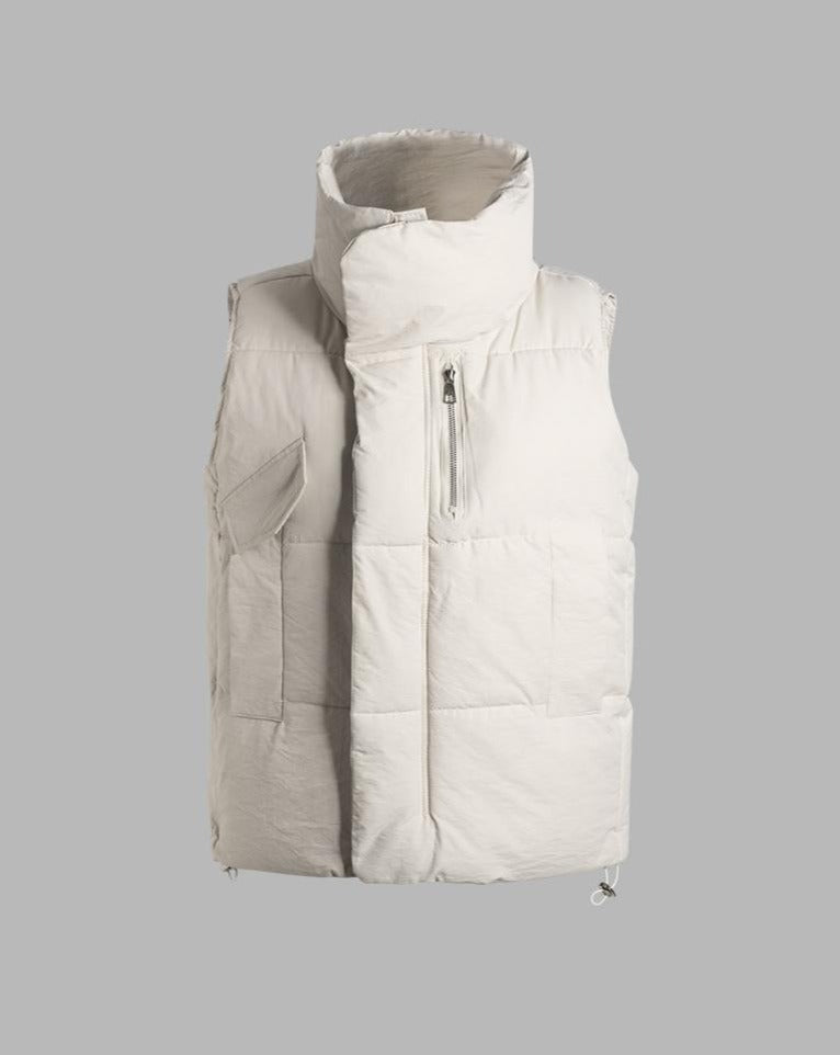 Details: Sleeveless puffer vest with front pocket and high-collar design