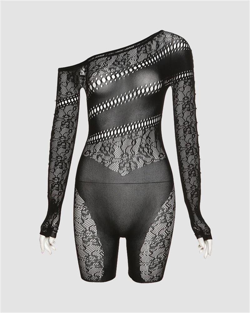 Details: Long-sleeve bodysuit with shorts. with mesh design and cut-out details