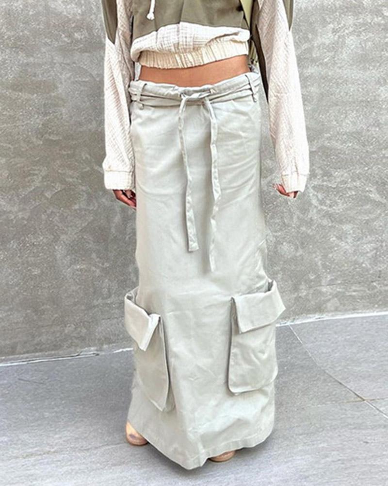 Details: Maxi cargo skirt with side pockets and drawstring design