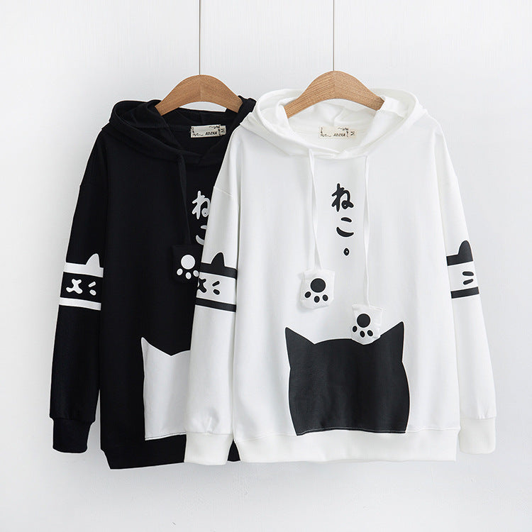 CUTE: Hoodie pullover with a cute design. The hat has a small ear. There is a cute cat's footprint at the bottom of the hat rope of the sweater.