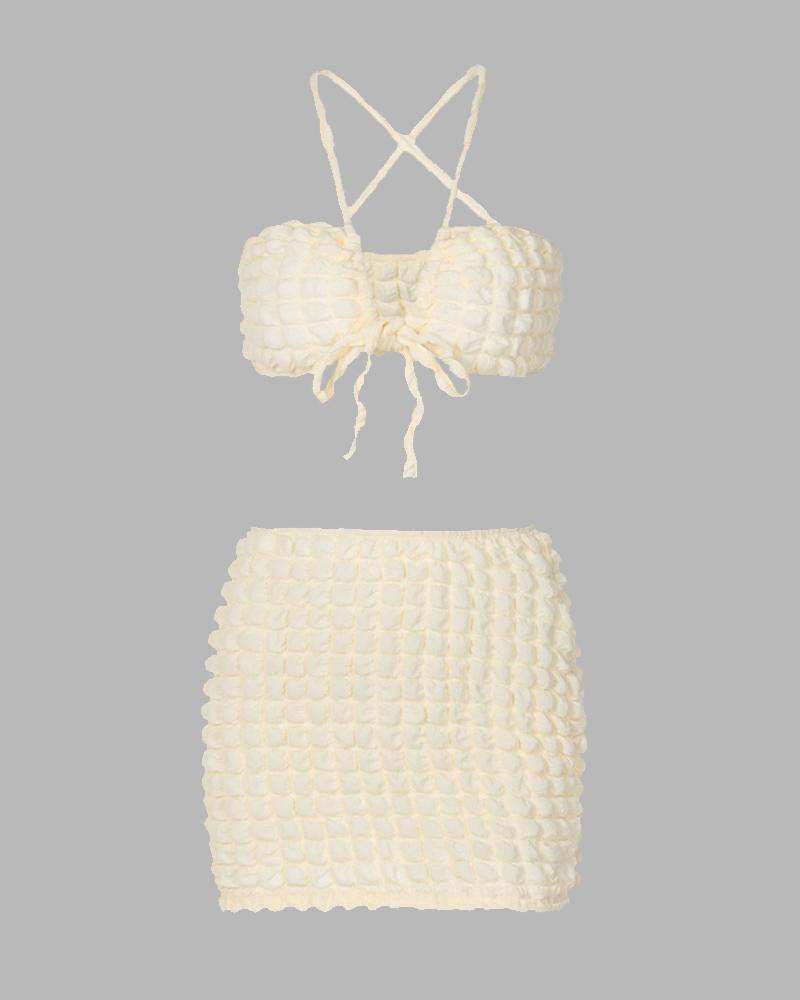 Details: Waffle-like coord set with cross-back bralet and short skirt