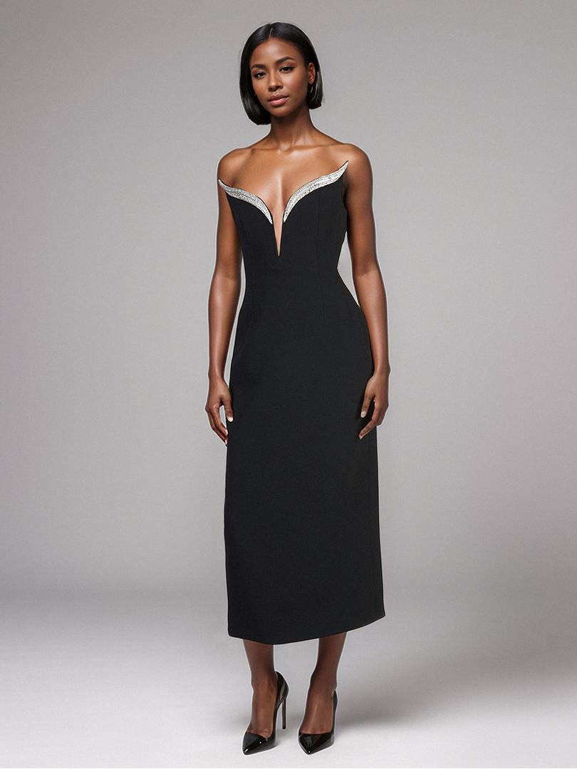 This midi dress is crafted from stretch-woven fabric. It features a jewel neckline, a strapless design, boning at the bodice, crystal embellishment at the front, and a split hem. It is lined and has a concealed zip fastening The dress measures 44 inches/112 centimeters in length. The dress is made from 50% viscose, 47% acetate, and 3% elastane. The lining is made from 64% viscose and 36% polyester. It is dry clean only. The dress has a regular fit and features a midweight fabric with slight stretch.