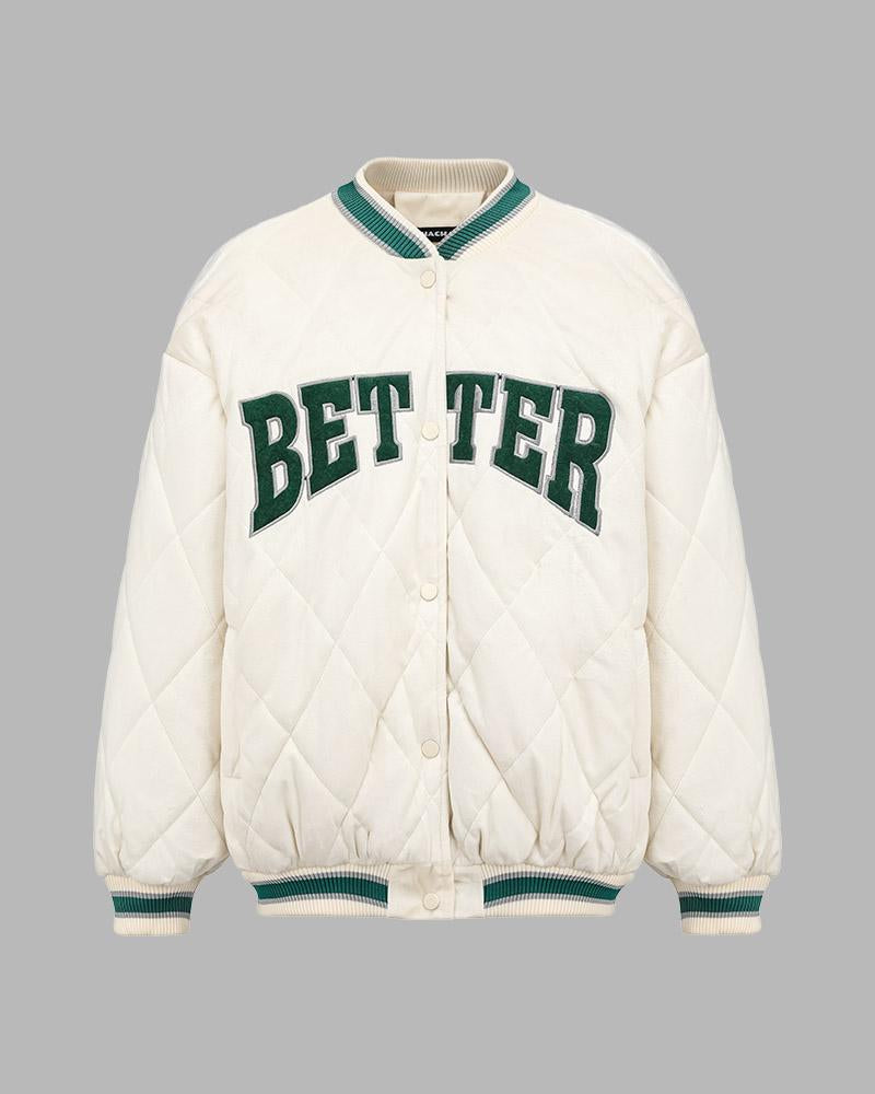 Details: Long-sleeve puffer jacket with "Better" letter design