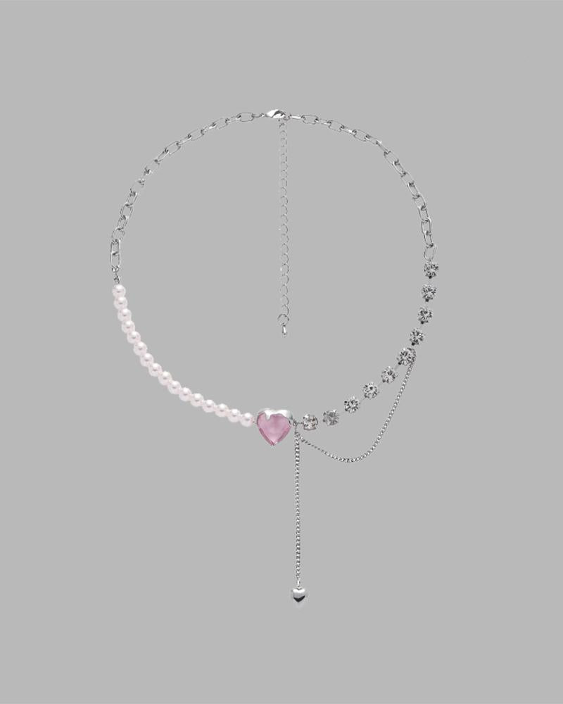 Details: Silver necklace with pearl beads and pink heart gemstone