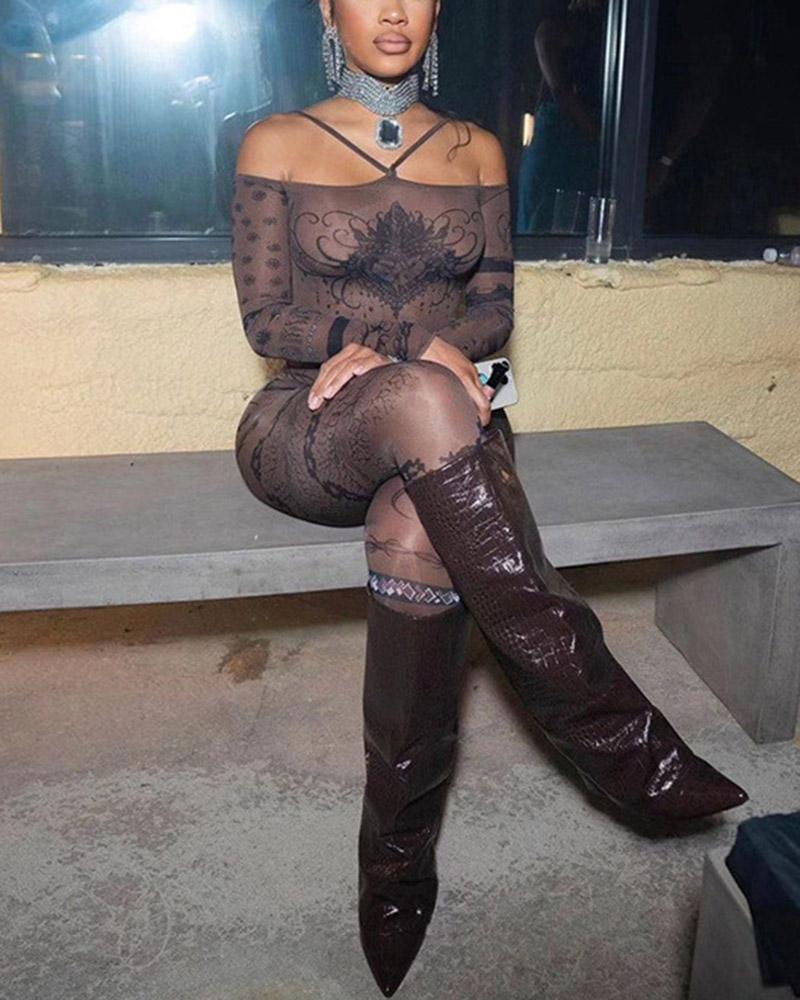 Details: Mesh jumpsuit top with renaissance graphical print