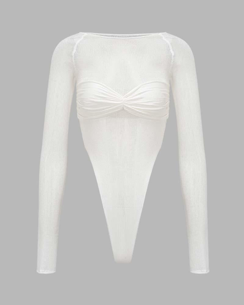 Details: Long-sleeve mesh bodysuit with front bralet design