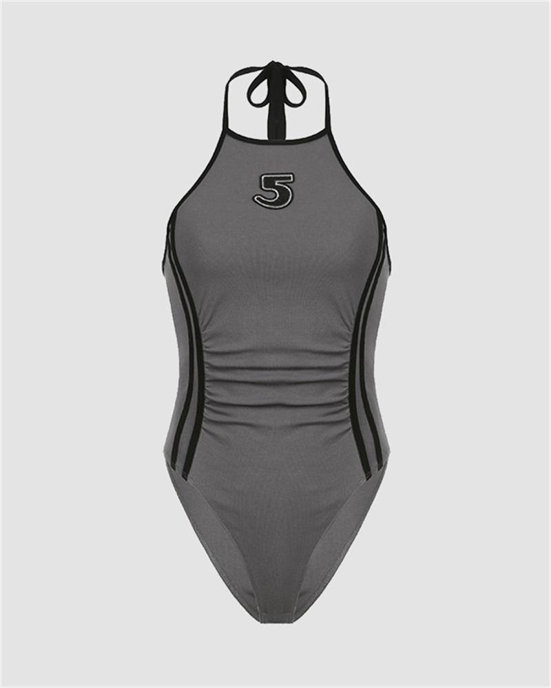 Details: Halter bodysuit with Number 5 print design