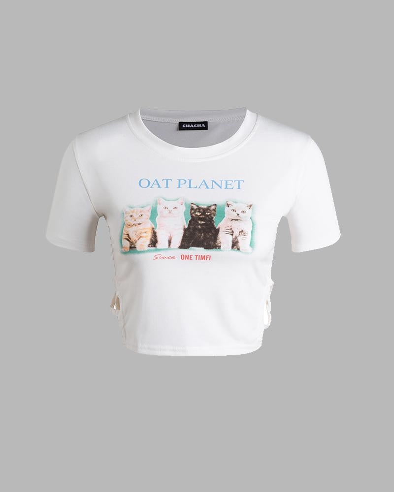 Details: Cropped T-shirt withwaist-line straps design. and cats print
