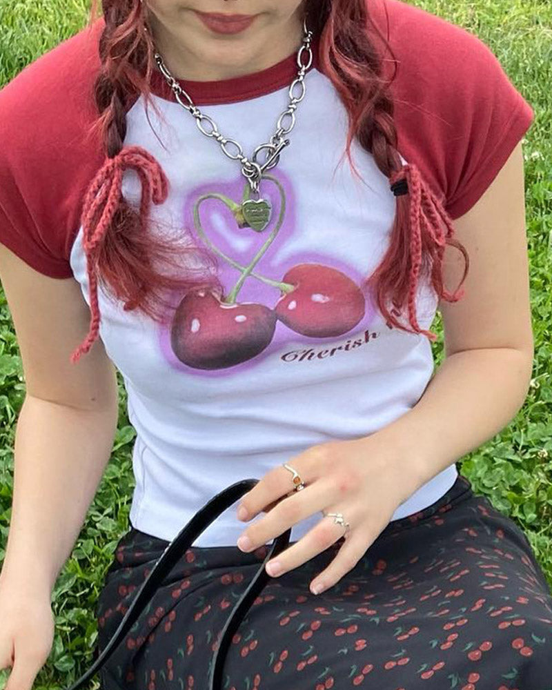 Details: T-shirt with "Cherish Me" letter and cherry graphical design