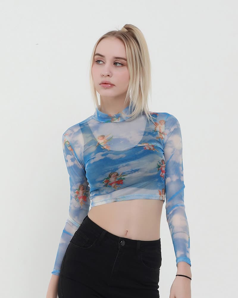 Details:K-Pop-inspired Cherub and Cloud Print Mesh Top