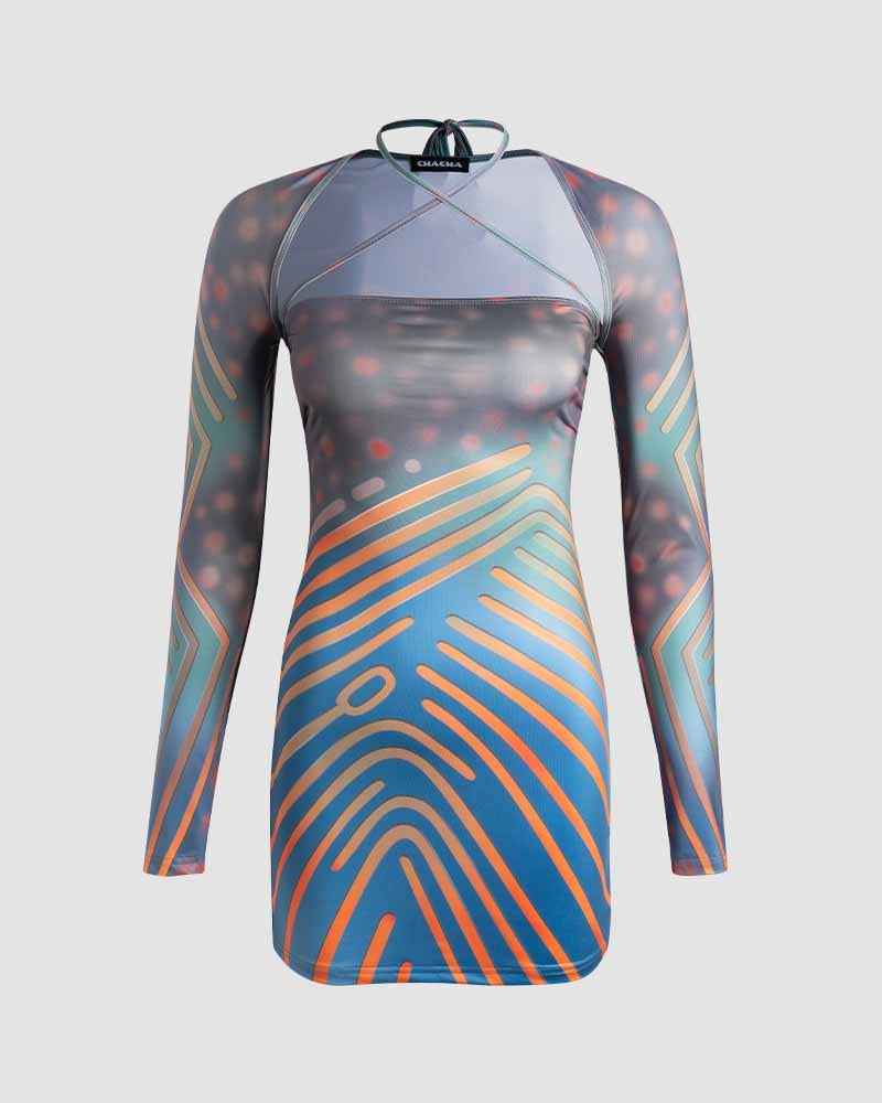 Details: Long-sleeve halter dress with abstract pattern