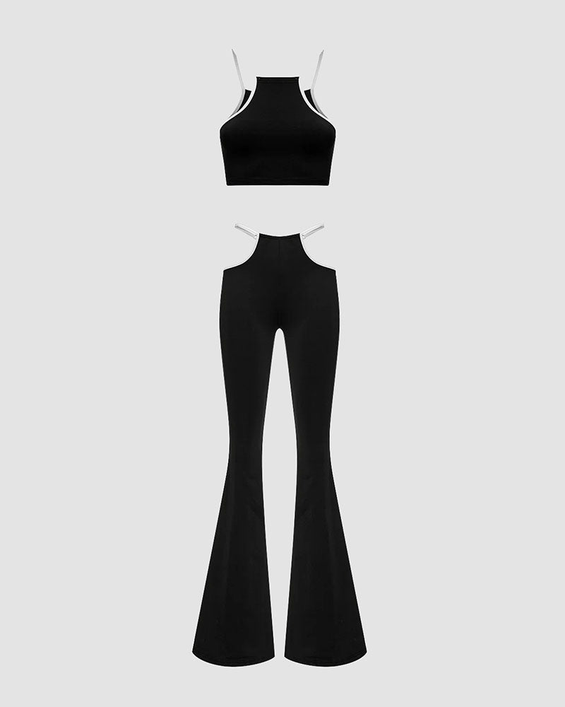 Details: Black coord set with matching sleeveless crop top and long pants with waist cut-out design