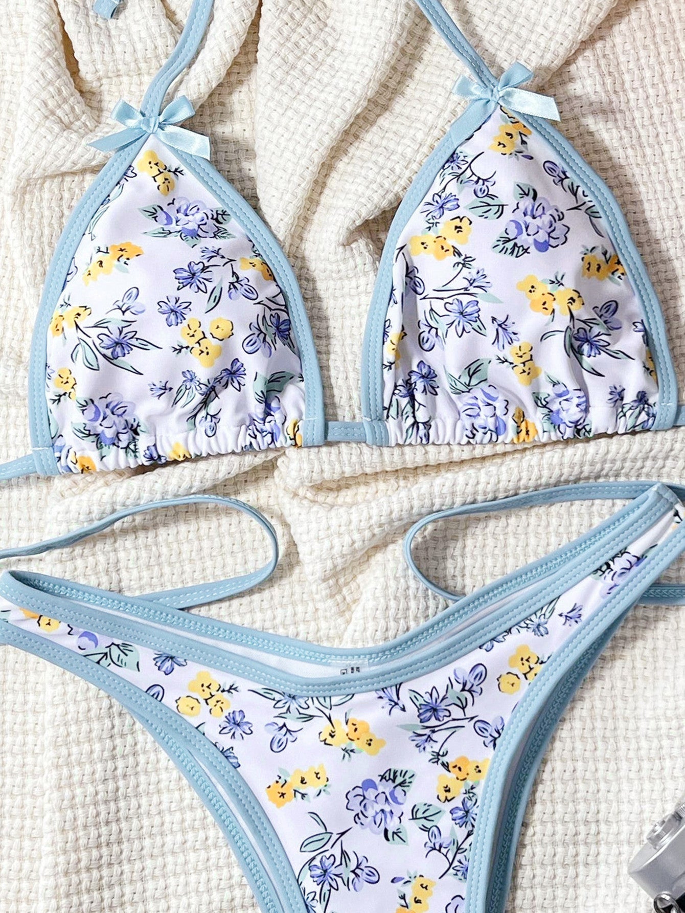 Say hello to soft girl summer in the Daisy Belle Floral Bikini Set �featuring a ditsy floral print. baby blue trim. and tiny bow accents for peak cottagecore-meets-coast. Triangle top with adjustable ties and cheeky bottoms keep it flirty and functional. Just add sun. sandals. and an iced lavender lemonade.
