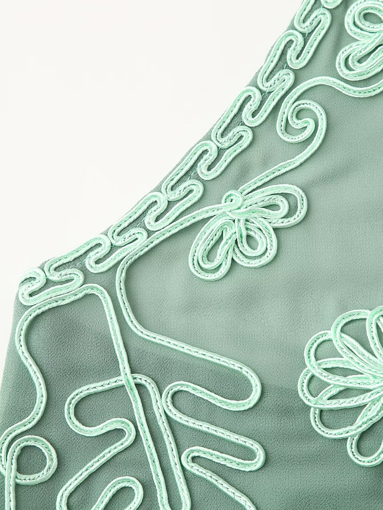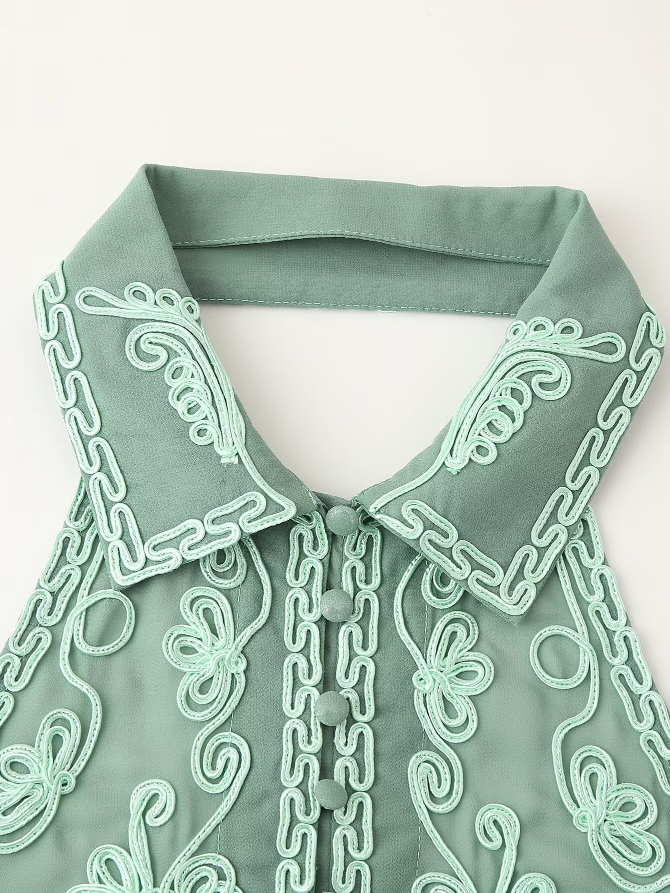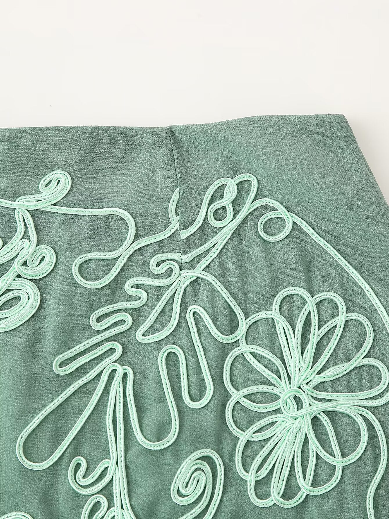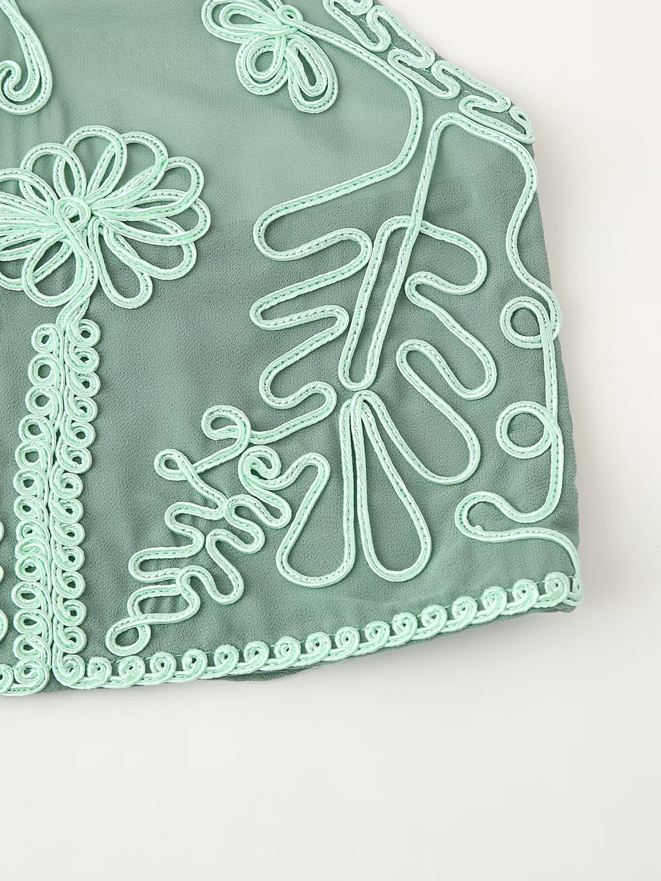 Flirty and fresh. the Delilah Garden Matching Set brings fairycore vibes to your closet with embroidered floral details and the dreamiest sage green hue. Featuring a halter crop top and a matching mini skirt. this duo is perfect for rooftop hangs or twirling barefoot at golden hour. Lightweight. sheer. and effortlessly bold—just like your weekend plans.