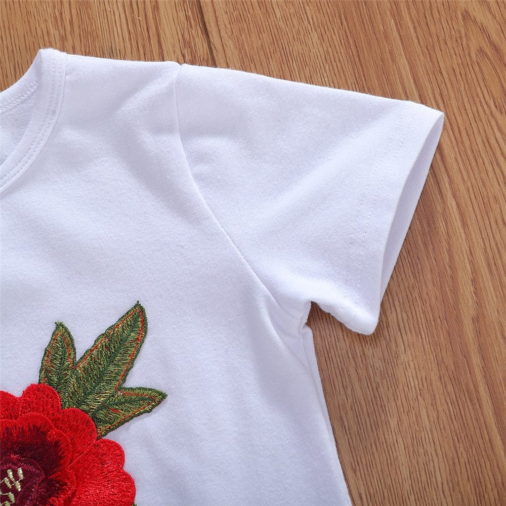 Our Della Baby Infant Two Piece Set is embroidered with a distinctive rose motif. this lightweight set includes a short sleeve top + denim short skirt that works perfectly for summer play.