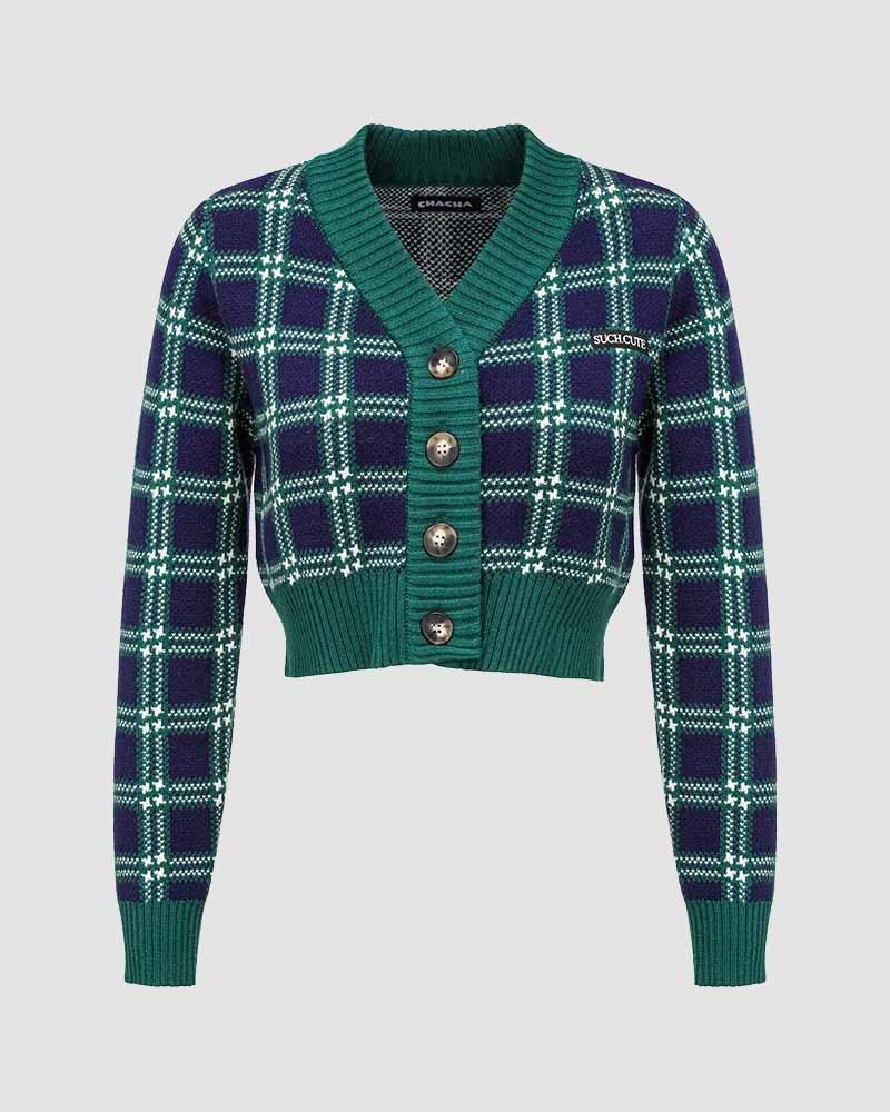 Details: Long-sleeve cropped cardigan with plaid pattern design