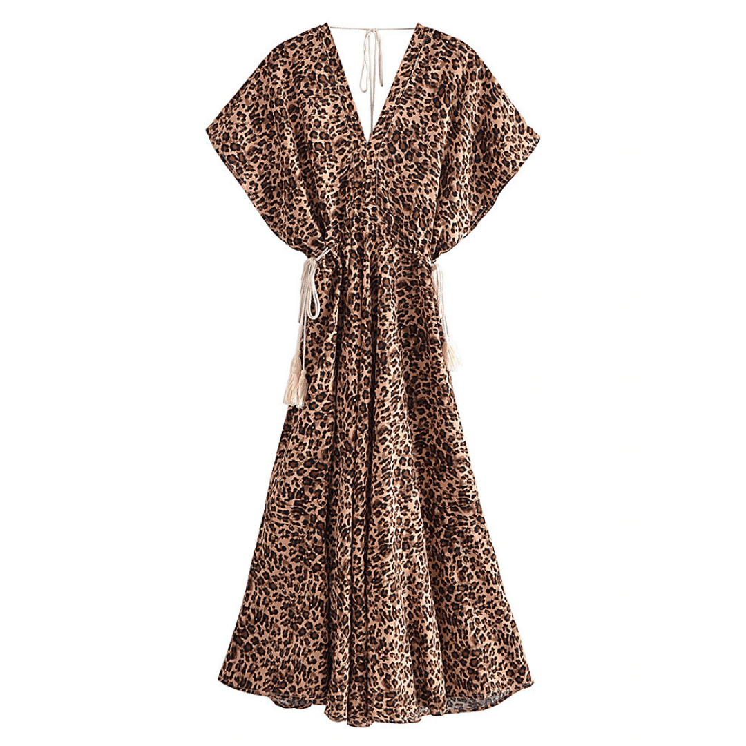 The ideal dress for any event. with a leopard design and a maxi-length silhouette with a V-neckline and batwing sleeves for added dimension.