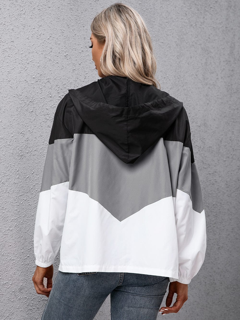 Stay dry and stylish with the Diora Hooded Rain Jacket. This jacket features a playful color block pattern and a convenient zipper for easy on and off. The loose fit and polyester fabric provide both comfort and functionality.