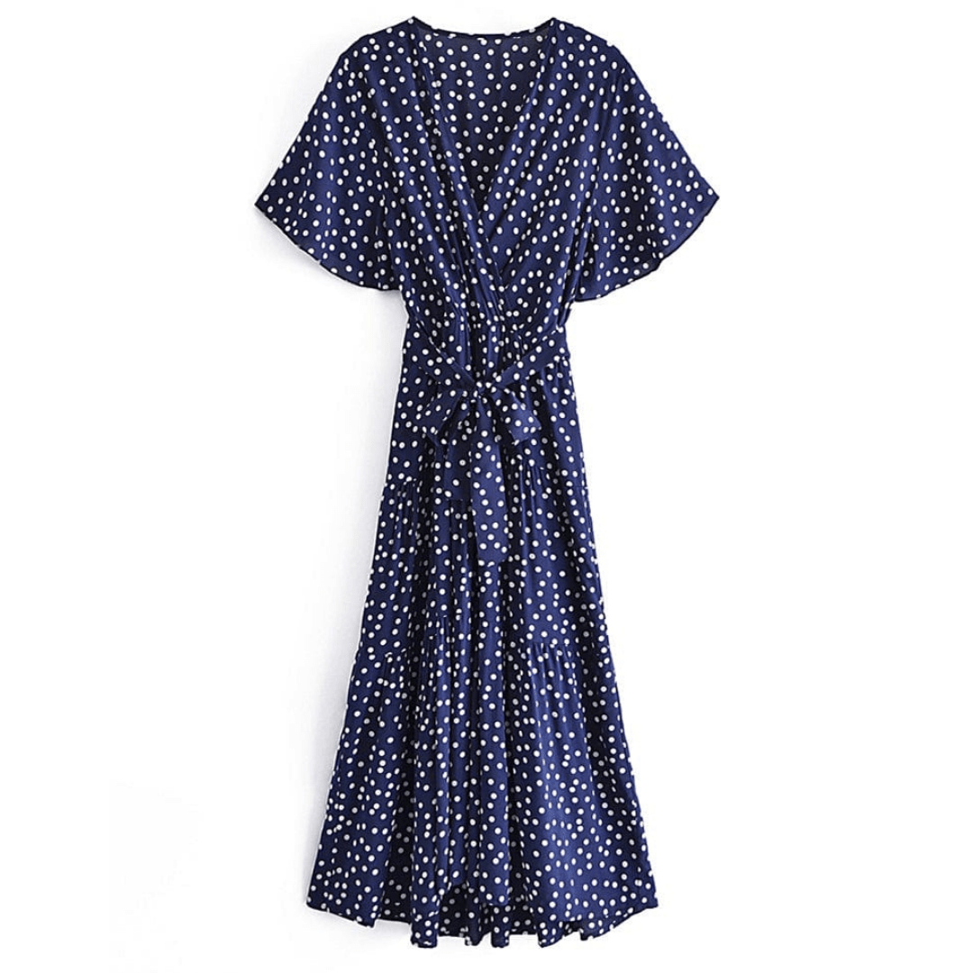 About: Flowy dotted maxi dress with a tiered skirt and short sleeves. as well as a V-neckline.