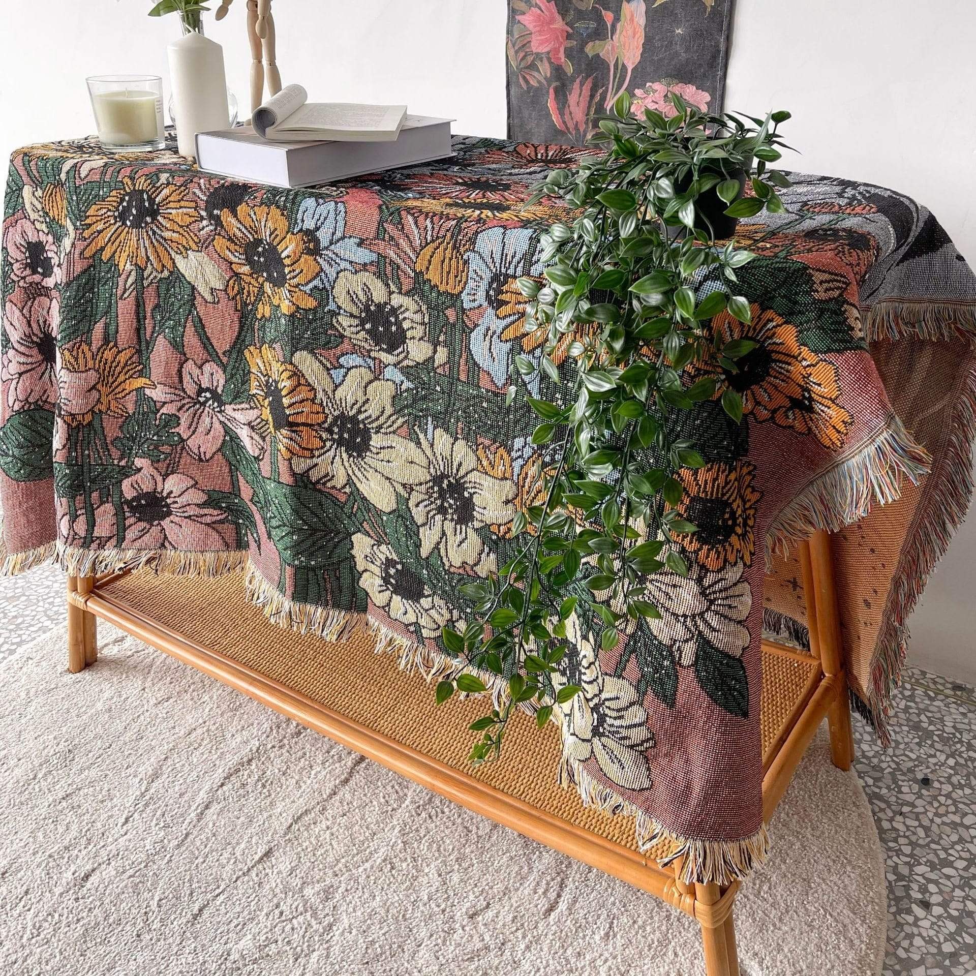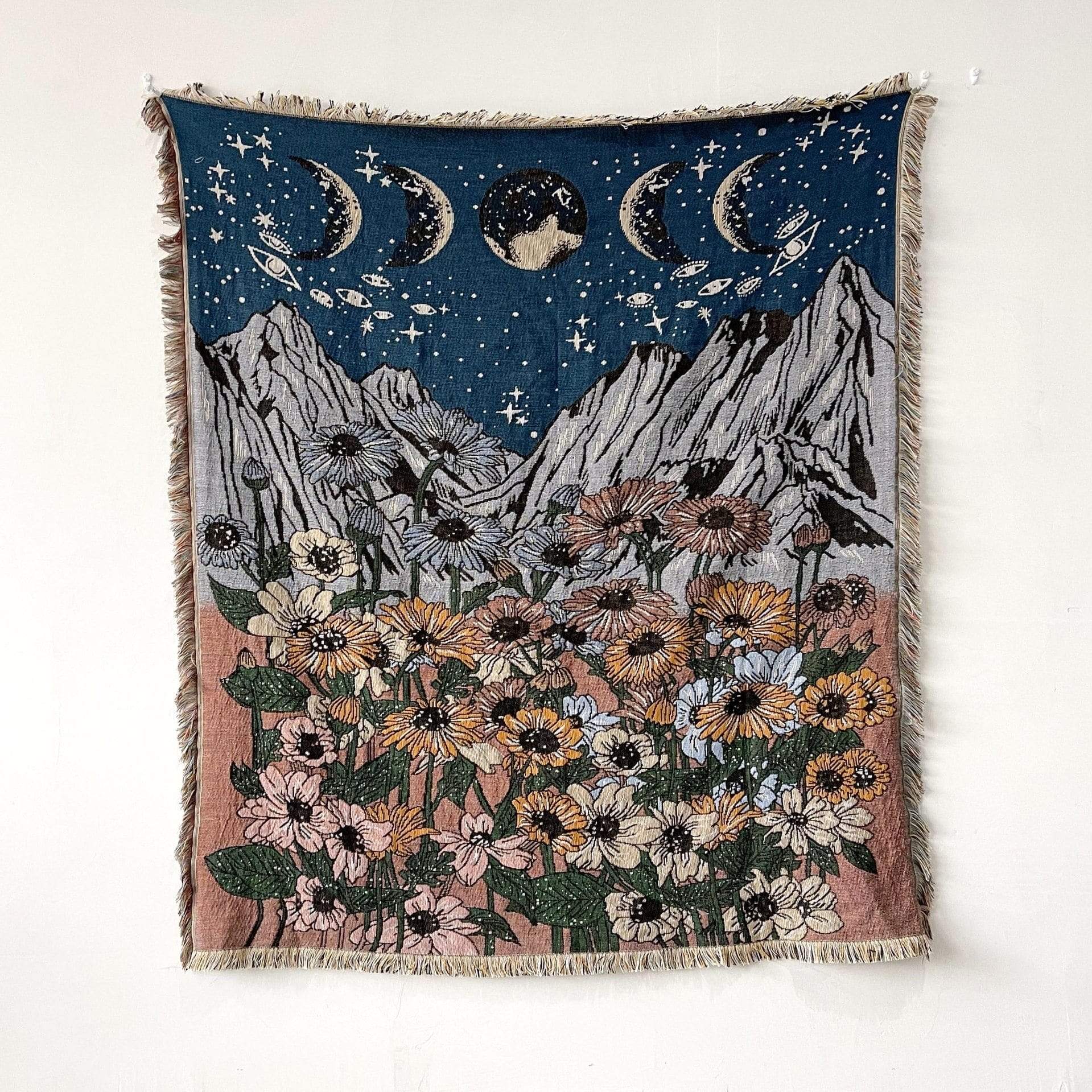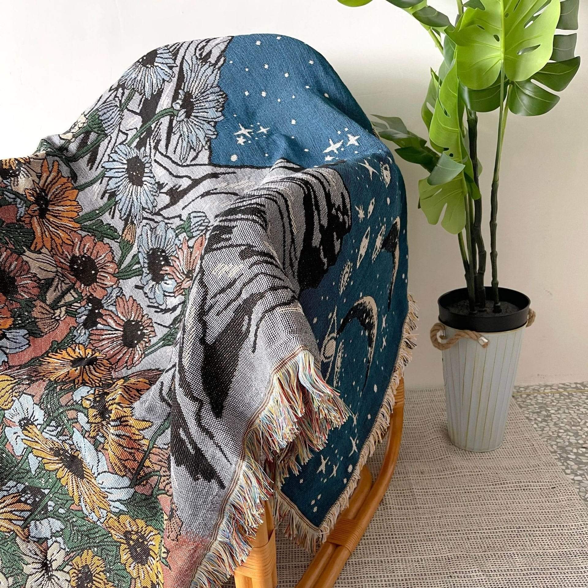 About: Intricate boho blanket. topped with a tranquil garden motif and the lunar phase. Finished with classic fringe trimming.