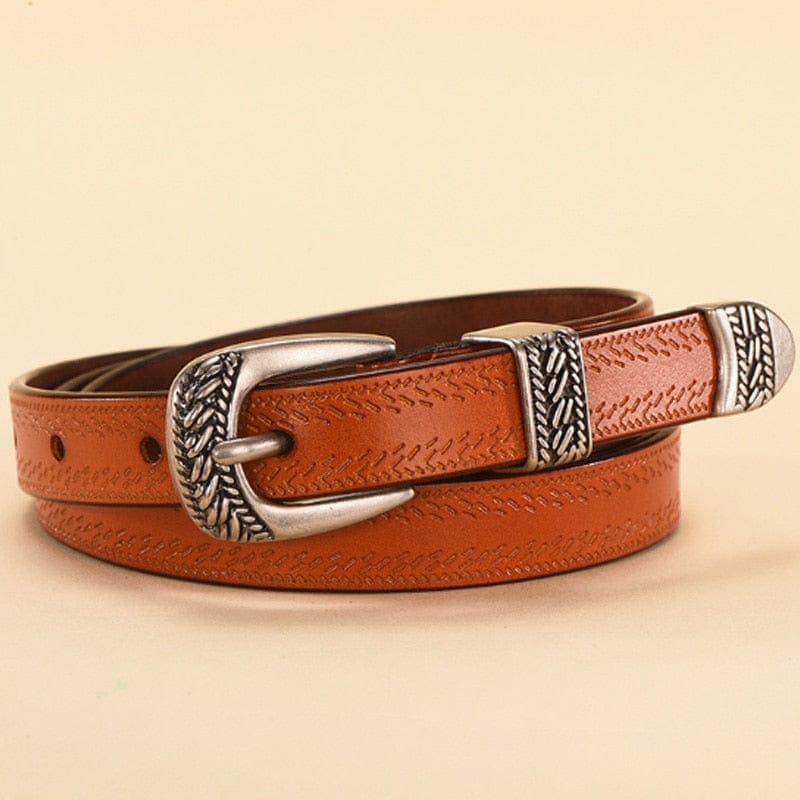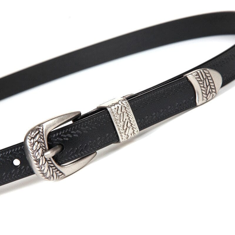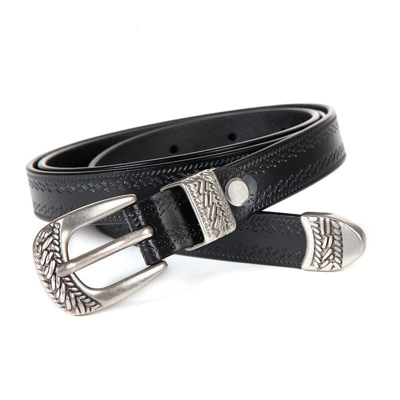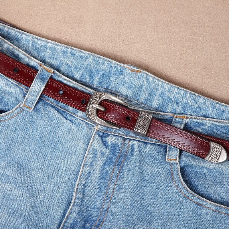 What would be trendier than this cowgirl Drew Leather Belt? A west-inspired belt that you can wear anytime. anywhere. a vintage style slim belt with a finely chiseled buckle and carved with a western floral pattern
