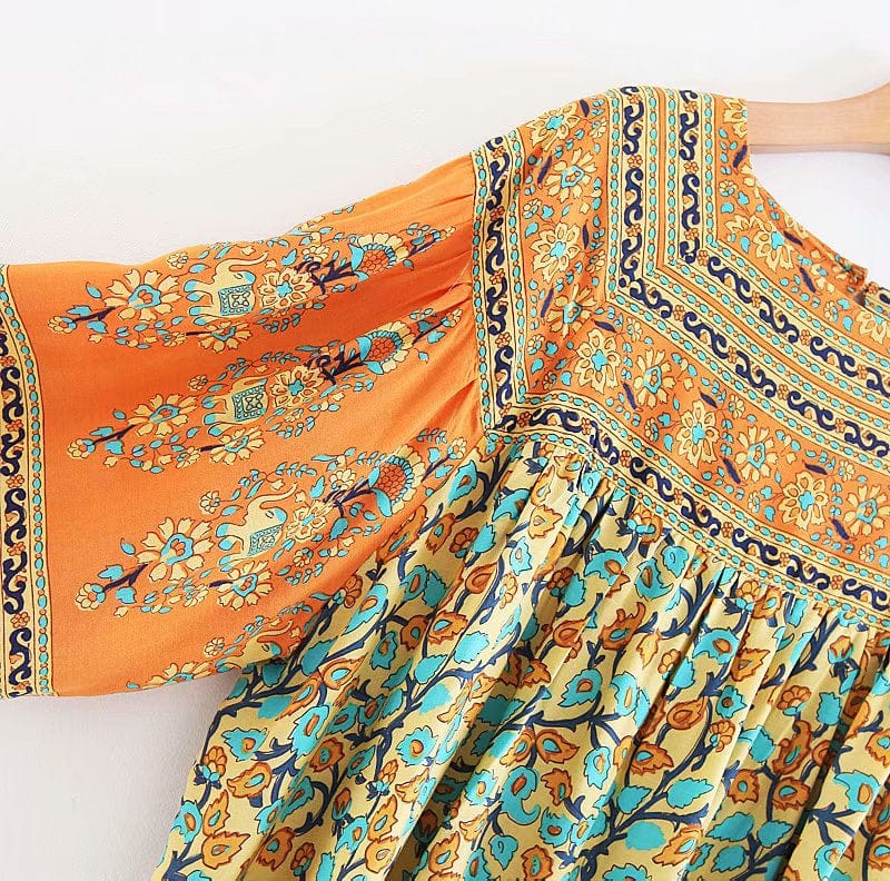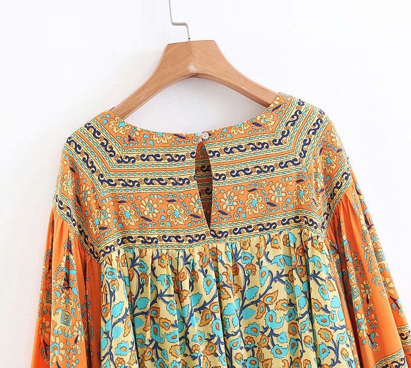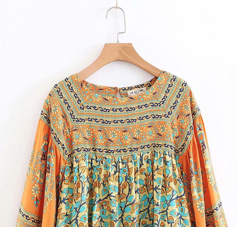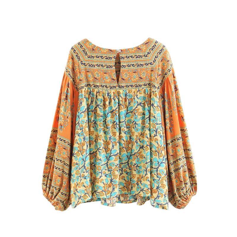 About: A gorgeous spring or fall blouse featuring a high neckline and loose sleeves. Matching skirt available. Loose fit.