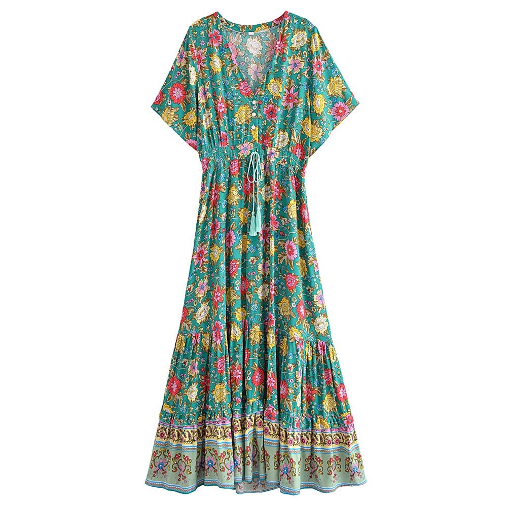 The Eirlys Floral Boho Maxi Dress is the perfect blend of bohemian style and feminine flair. The signature boho print features a vibrant floral design that is sure to make a statement wherever you go. The v-neck and button closure to the waist add a touch of sophistication. while the elasticated waist with hanging tassel ties adds a playful. bohemian touch.