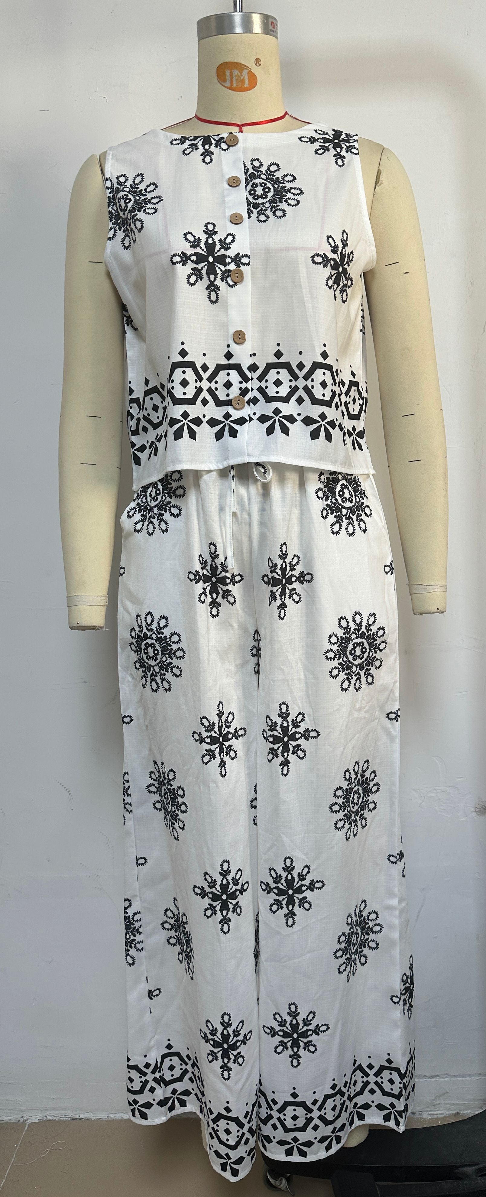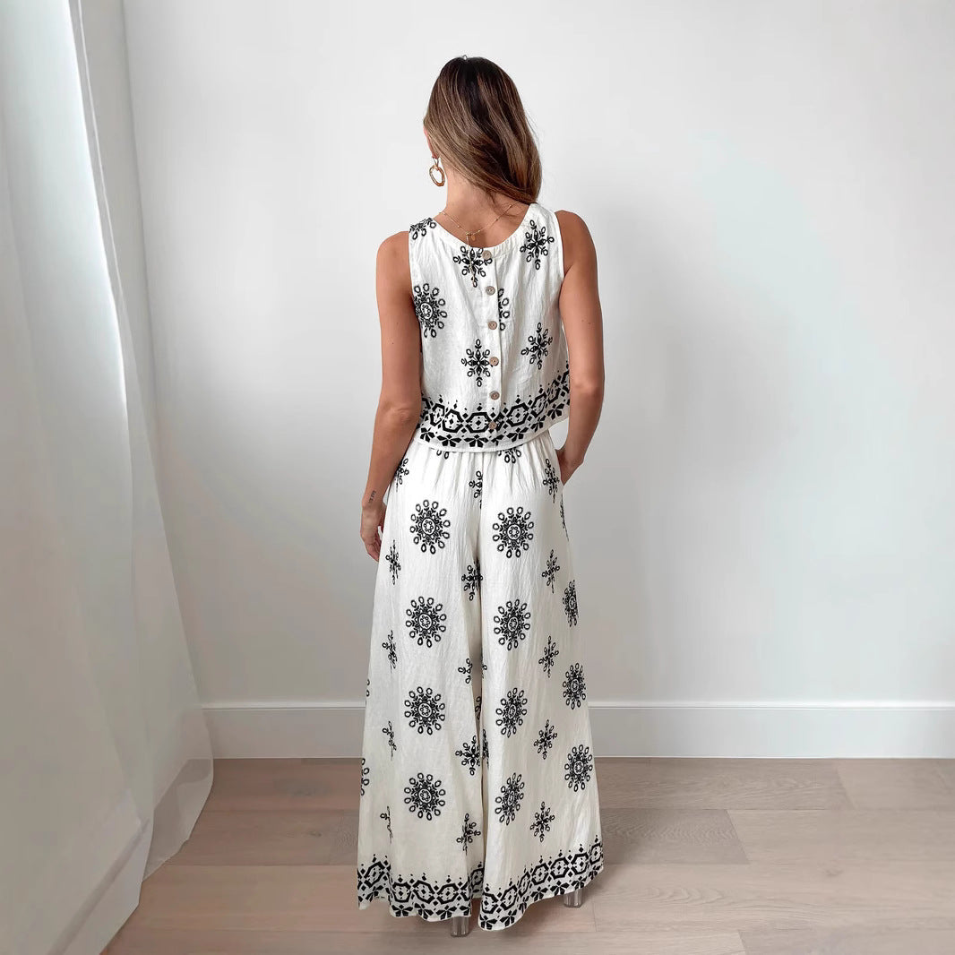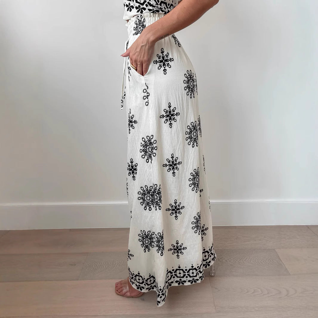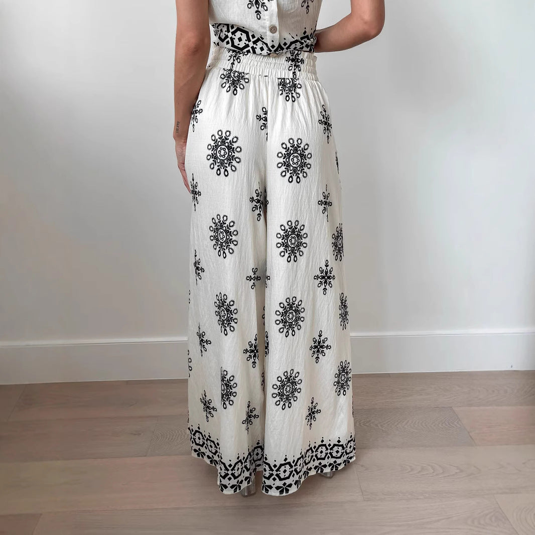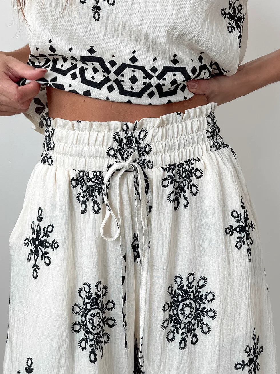 Breezy. boho. and effortlessly cool—the Elara Boho Embroidered Two-Piece Set is your new summer go-to. Featuring intricate embroidery on a lightweight. flowy fabric. this dreamy set includes a cropped halter top and wide-leg pants for that laid-back. sun-kissed vibe. Perfect for beach strolls. music festivals. or just feeling free-spirited wherever you go.