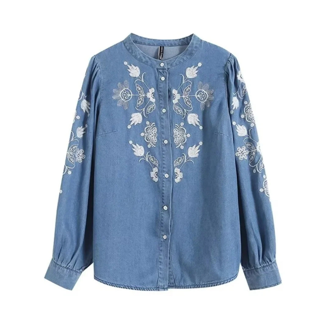 Upgrade your casual wardrobe with the Elena Denim Blouse. Featuring delicate white floral embroidery on soft denim fabric. this button-up shirt blends timeless charm with boho elegance. Perfect for effortless styling. pair it with jeans or skirts for a chic everyday look.