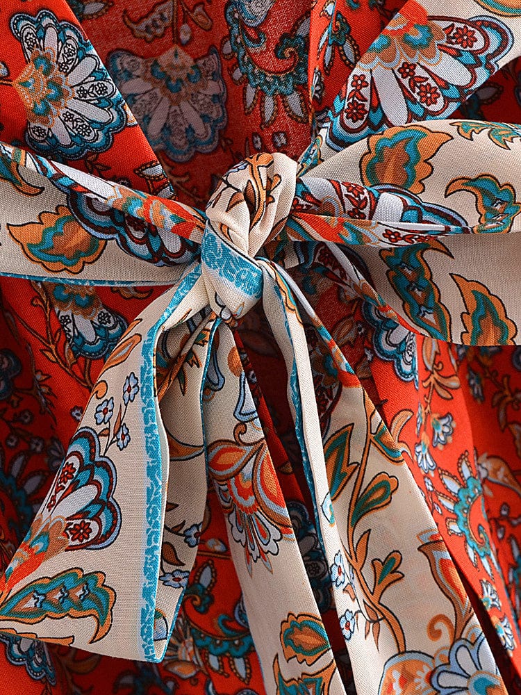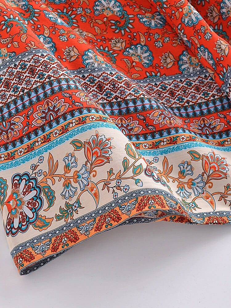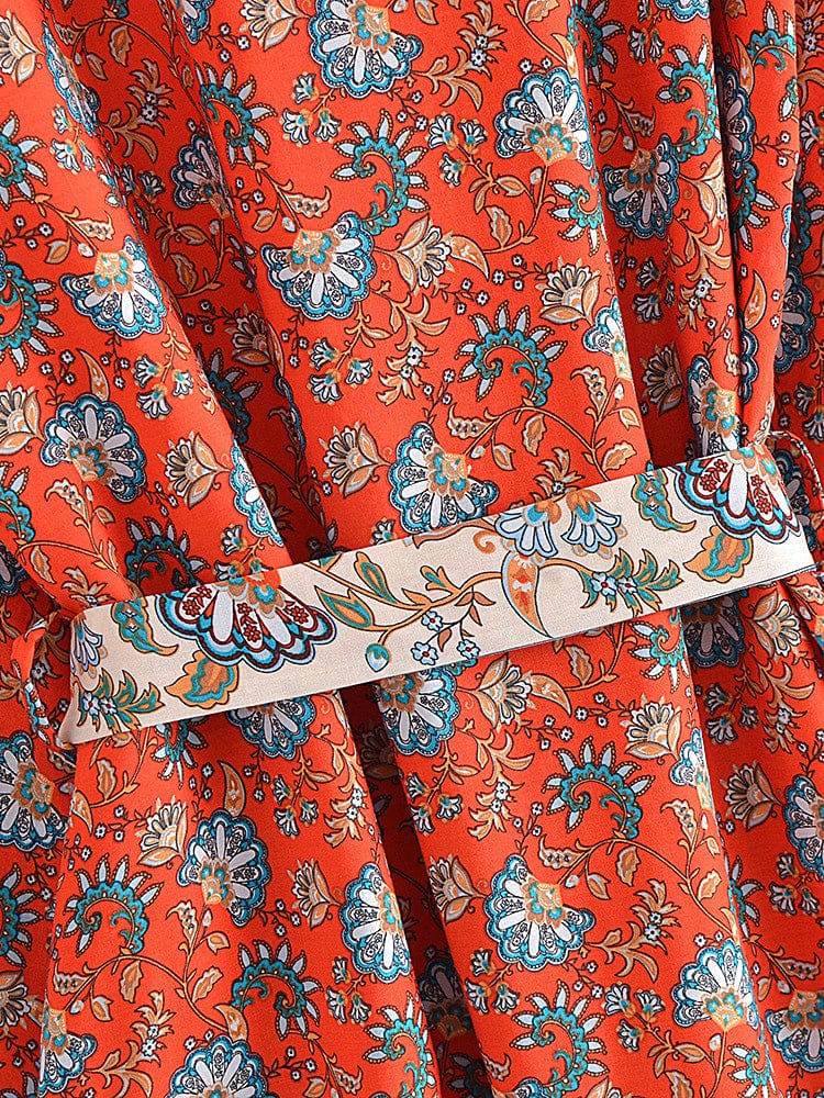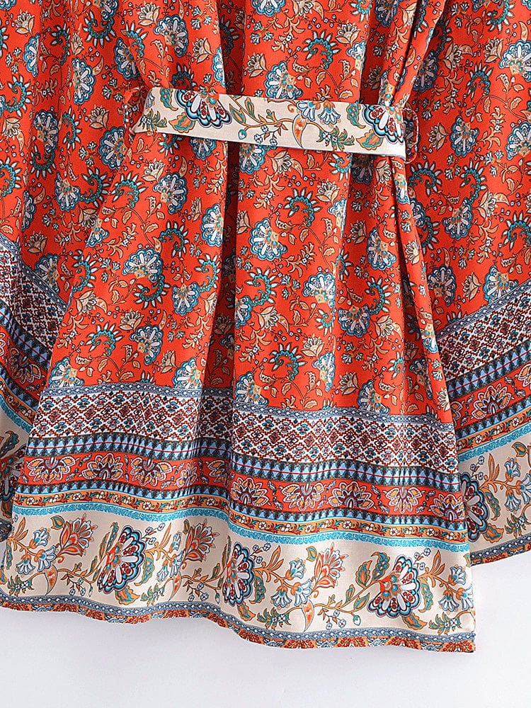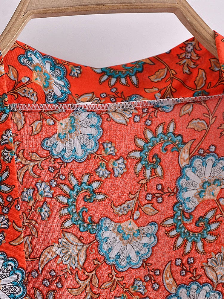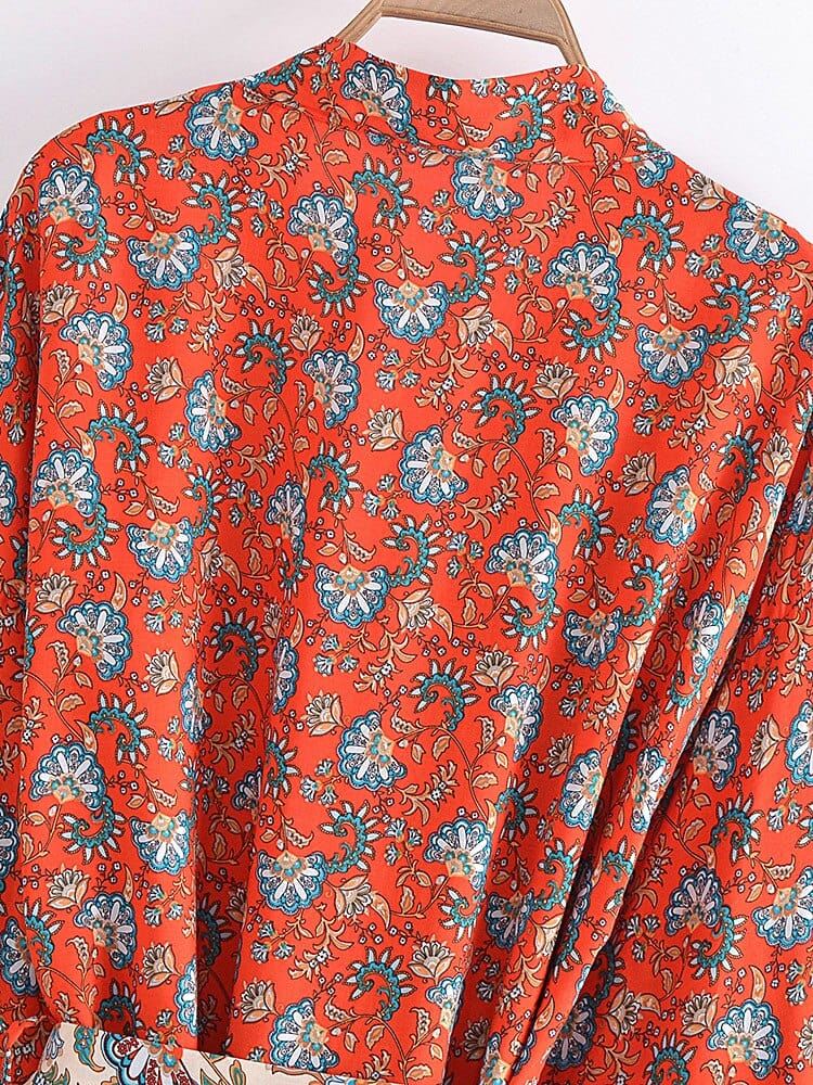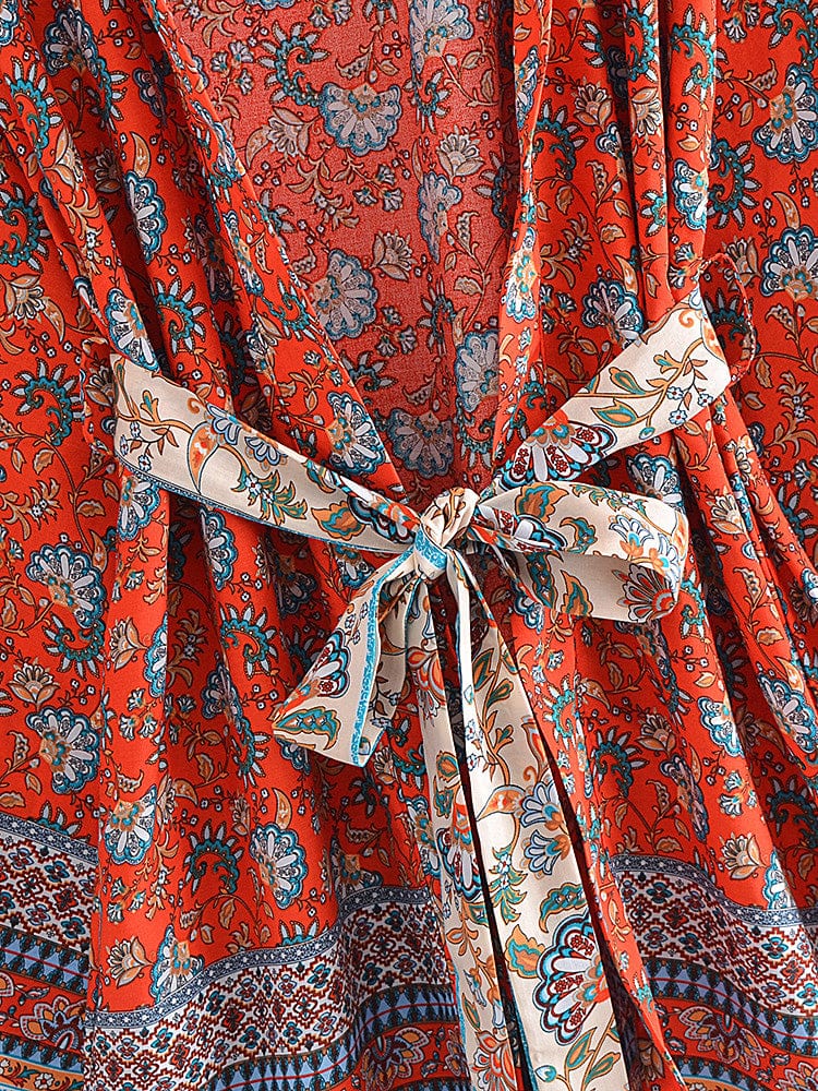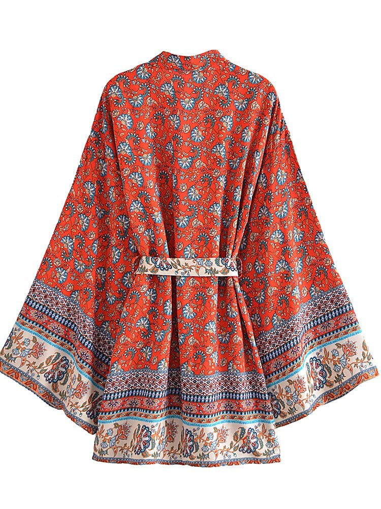 This bohemian kimono features a traditional. floral pattern throughout for enhanced dimension and an oversized. open-front silhouette.