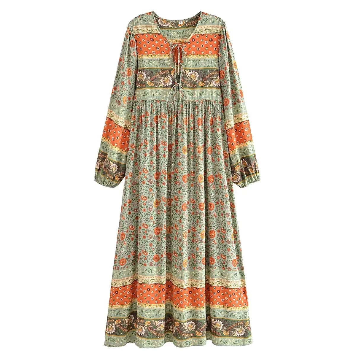 Crafted for comfort and style. the flowing silhouette of this maxi dress exudes grace and versatility. The intricate floral designs enhance its boho allure. making it a perfect choice for both casual outings and special occasions.