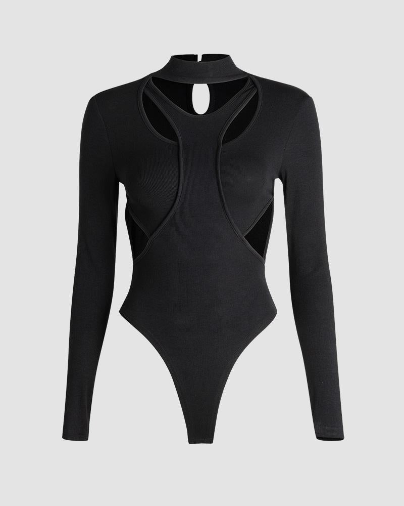 Details: Long-sleeve bodysuit with choker design and front cross-over details