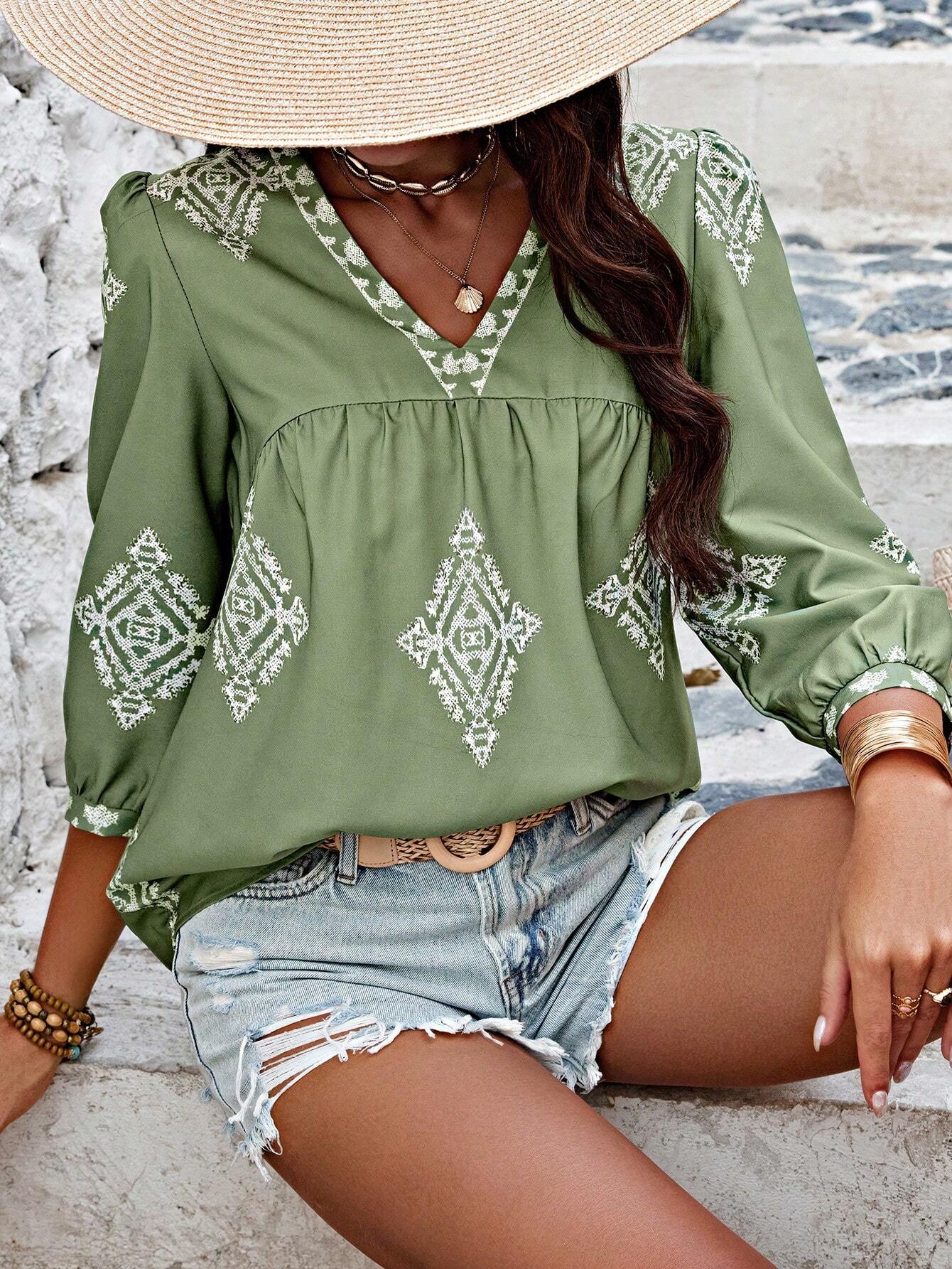 Breezy and effortless. the Esme Embroidered Blouse is your go-to for that laid-back. boho-chic vibe. Featuring intricate geometric embroidery. a relaxed silhouette. and a flattering V-neckline. it's the perfect mix of casual and elevated. Pair it with distressed denim and layered jewelry for an effortlessly cool. wanderlust-ready look.
