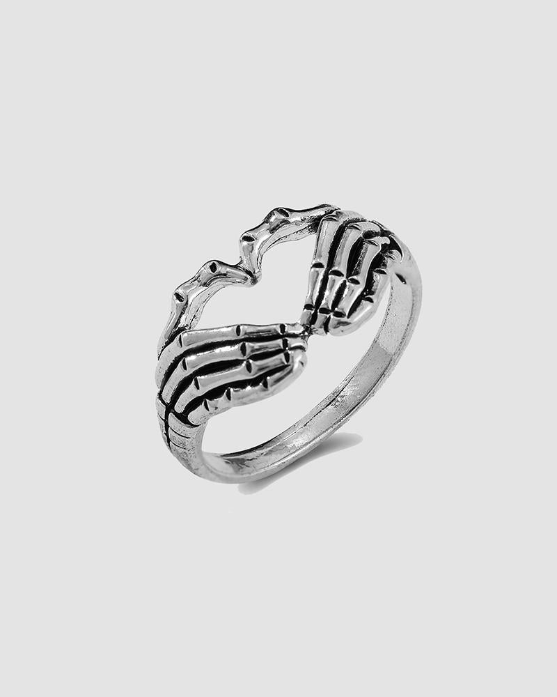 Details: Unique ring design with skeleton finger forming a heart shape. with adjustable size