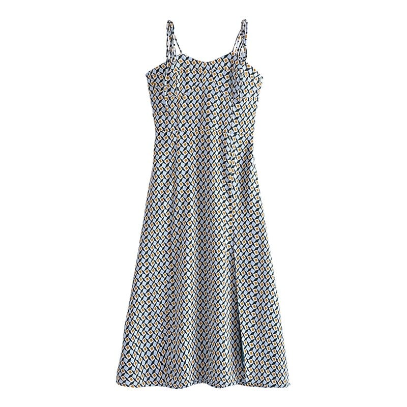 Euthalia Midi Dress in all-over patterned print. Slim fitting throughout the bodice with a relaxed skirt. A concealed side zip opening and deep side slits. A cool and versatile garment. casual chic charm.