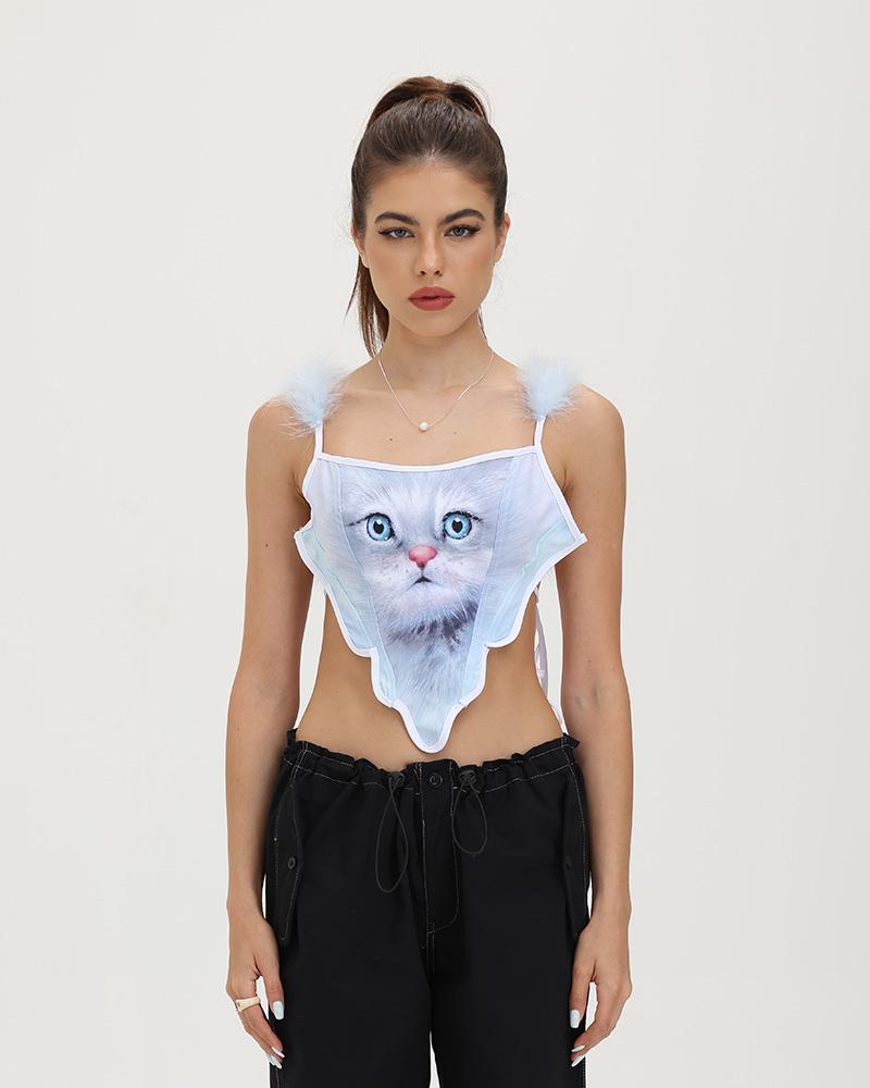 Details: Backless cropped top with cute cat image print and shoulder fuzz details