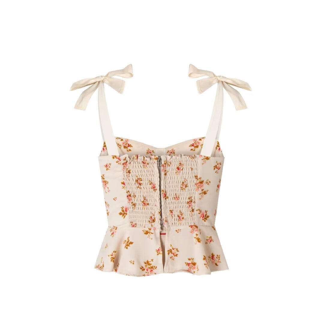 The Fleur Floral Bow-Tie Top brings soft. vintage-inspired charm to your wardrobe with its delicate floral print and playful bow-tie straps. Featuring a flattering sweetheart neckline and peplum hem. it's perfect for pairing with high-waisted jeans or flowing skirts for an effortlessly romantic vibe. Lightweight and breezy. it's your go-to for sunlit strolls or coffee dates.