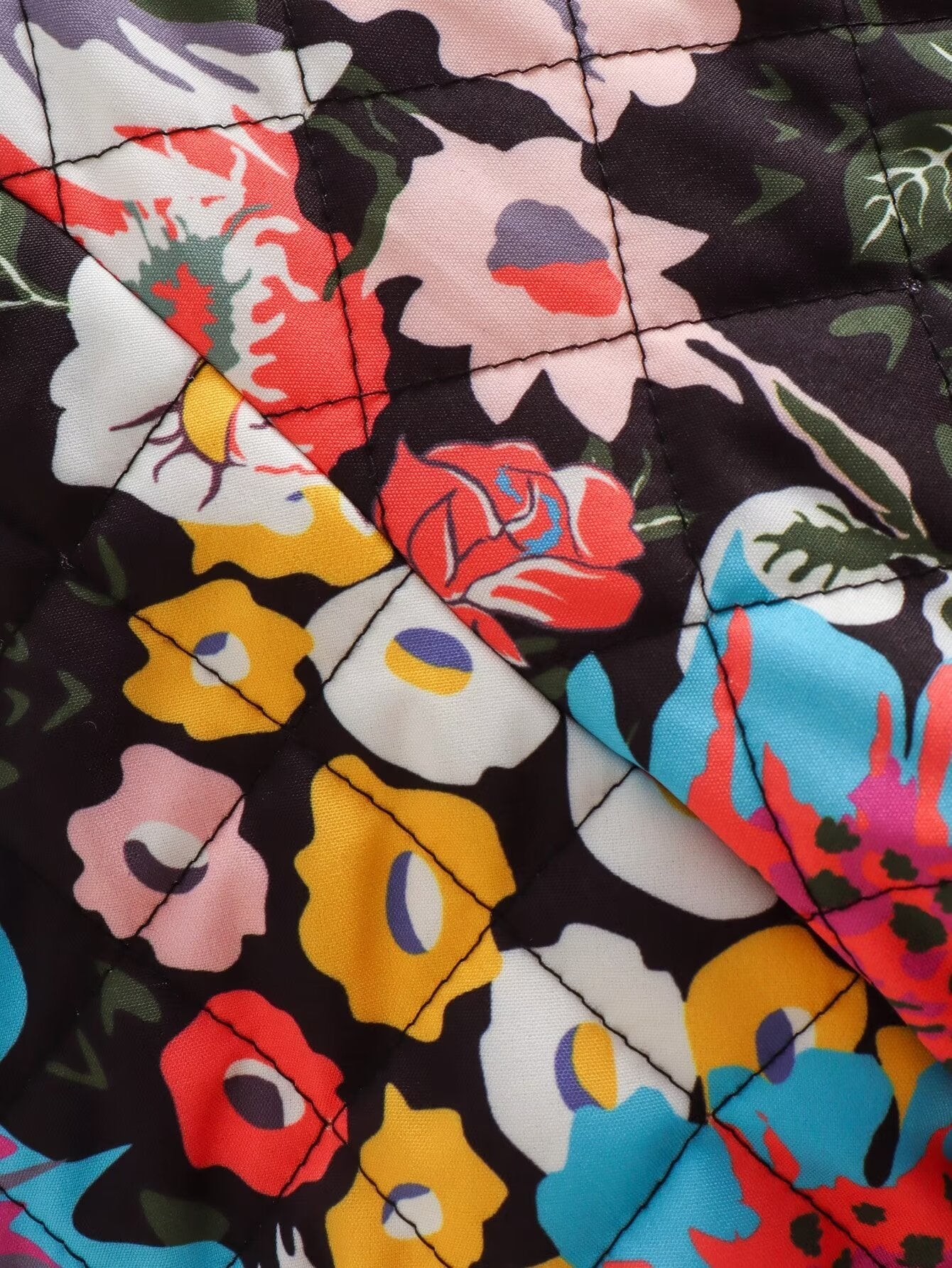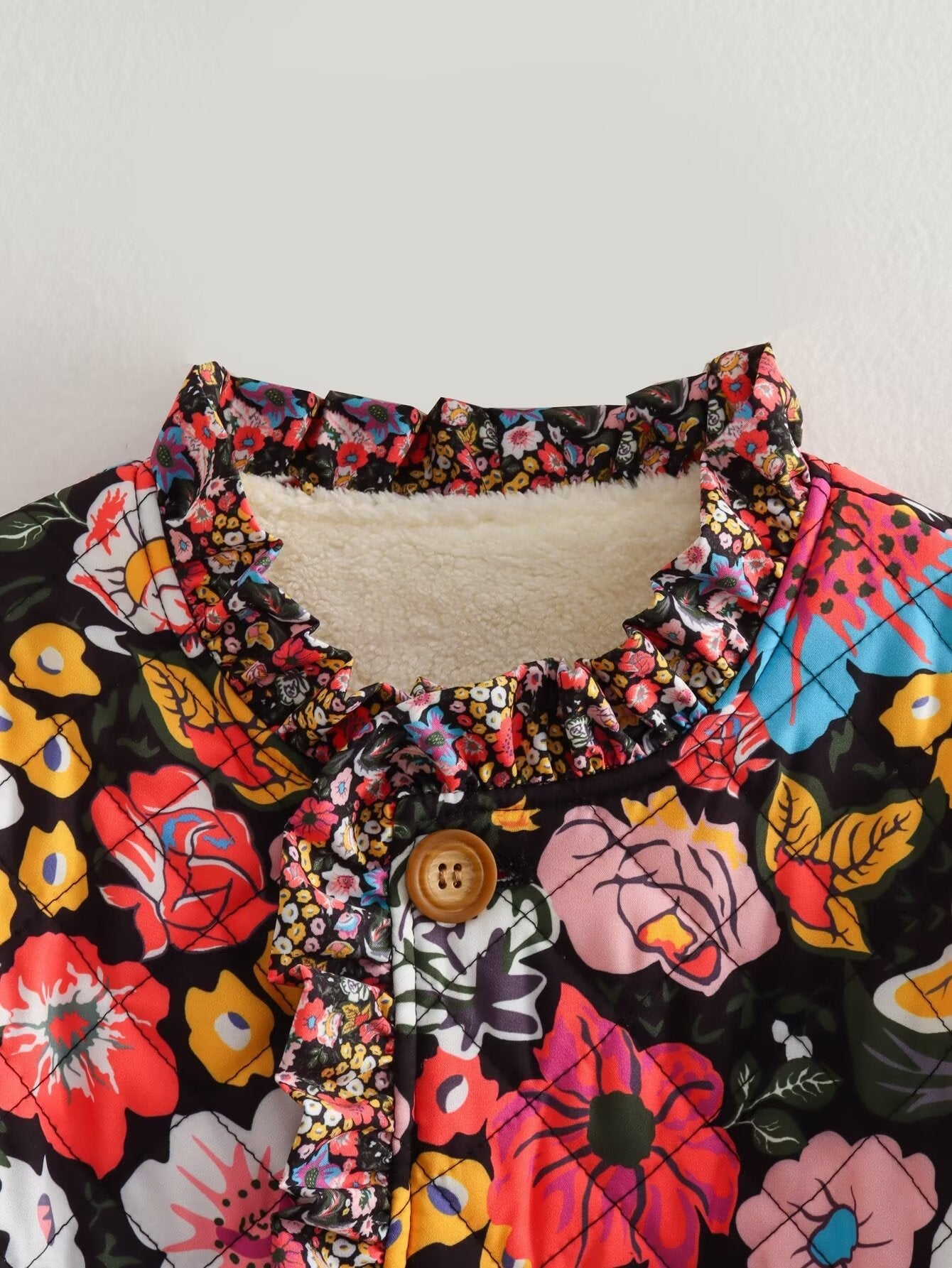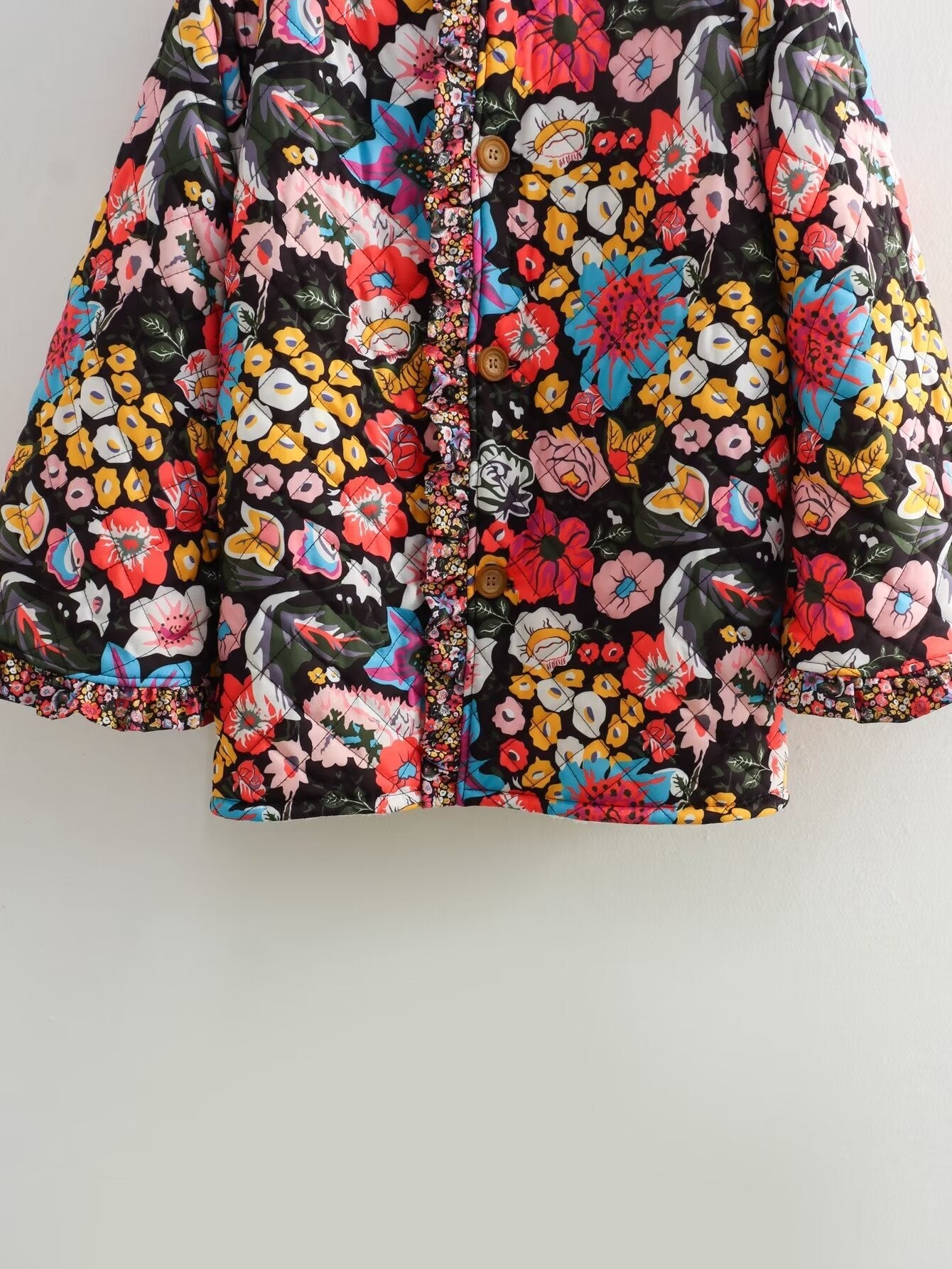 Wrap yourself in whimsical charm with the Flora Belle Quilted Jacket. Featuring a bold. eye-catching floral print and cozy quilted design. this jacket adds a playful pop of color to chilly days. Finished with delicate ruffle trim for a romantic. boho-inspired touch.