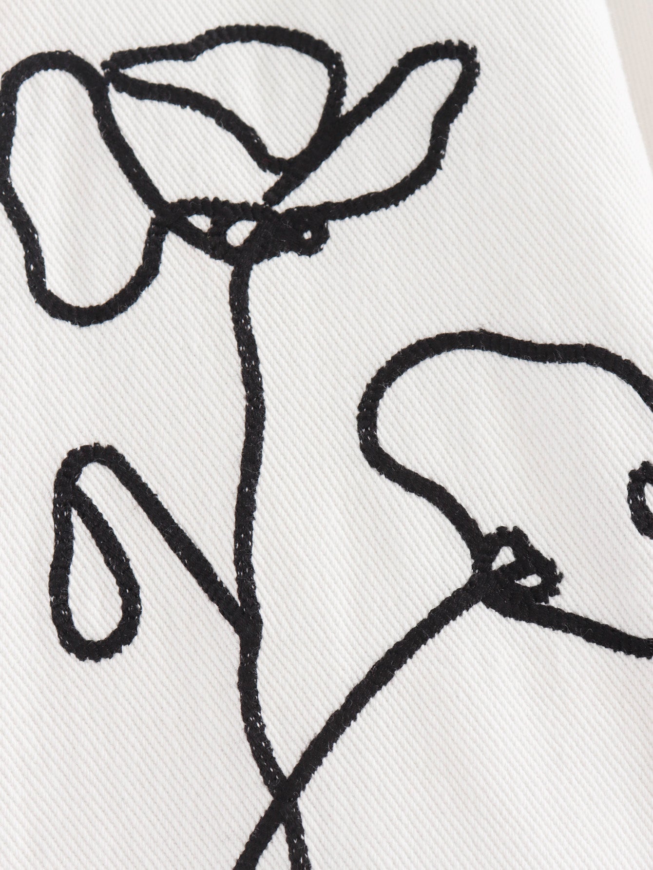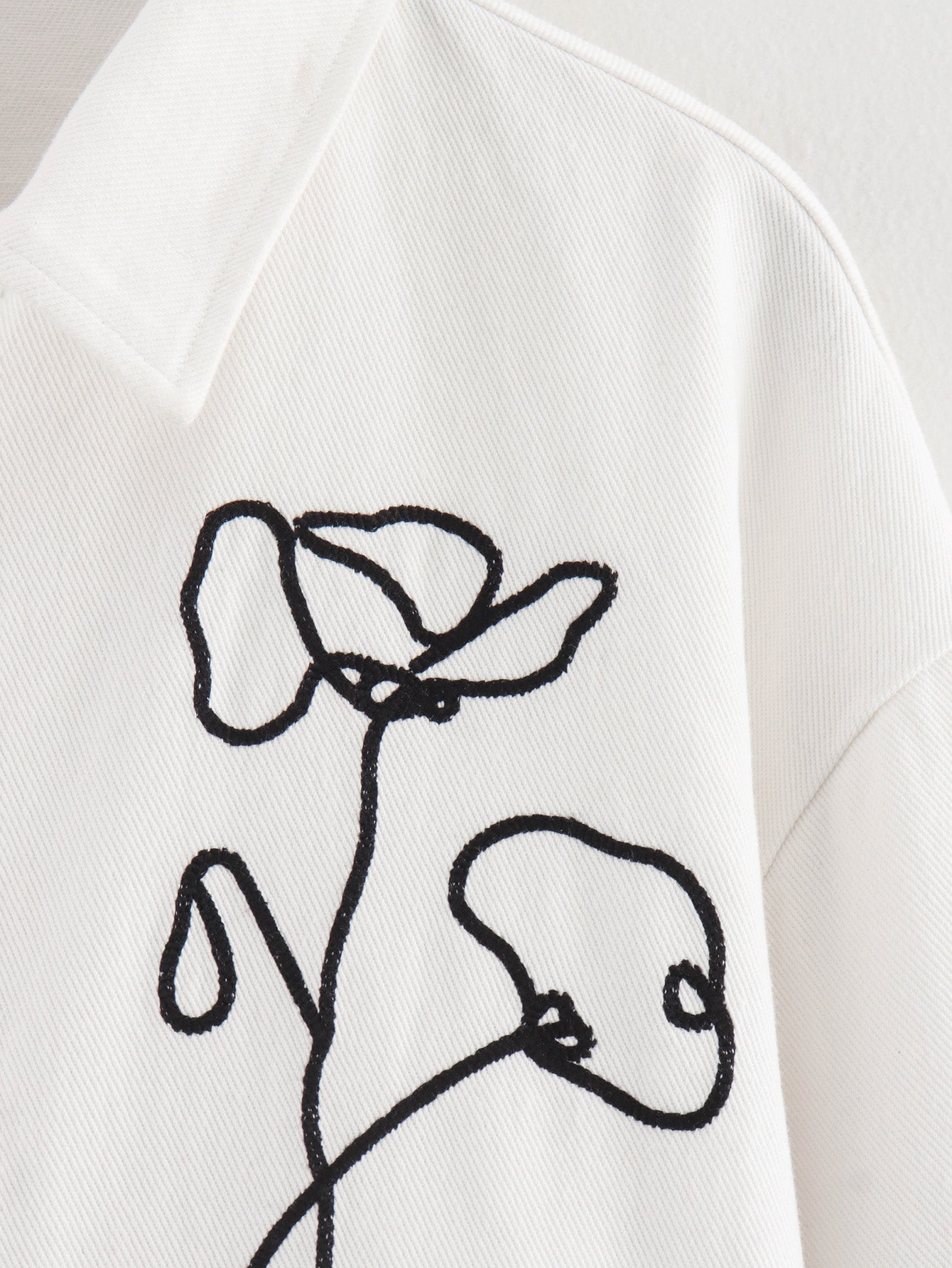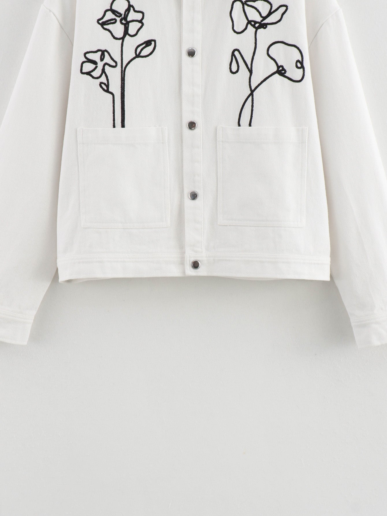 The Flora Embroidered Canvas Jacket is where clean lines meet artistic flair. featuring delicate floral embroidery that adds a minimalist yet bold touch. Crafted from sturdy canvas. it's the perfect lightweight layer to elevate your casual looks. Pair it with high-waisted jeans for an effortlessly cool. artsy vibe.