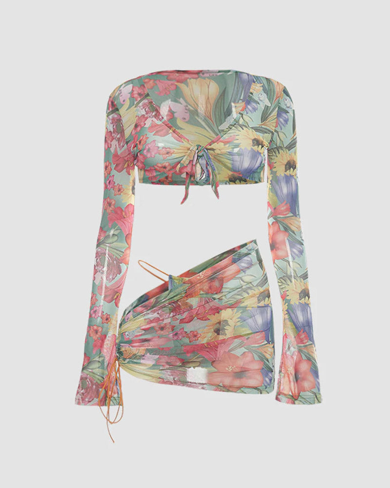 Details: Floral-print three piece coord set. coming with long-sleeve crop top with front ribbon design. and assymetrical short skirt
