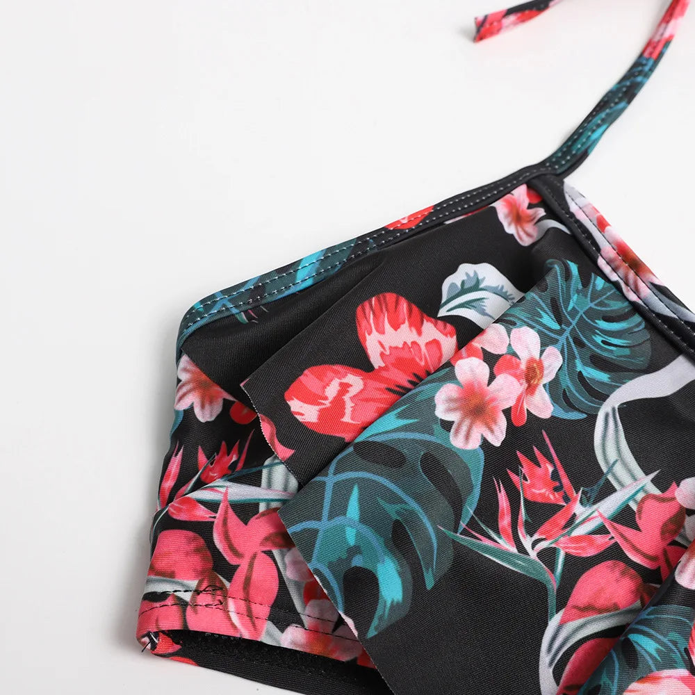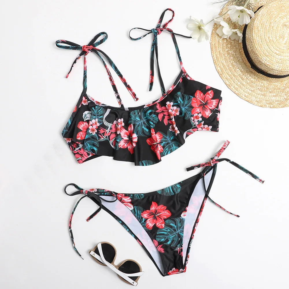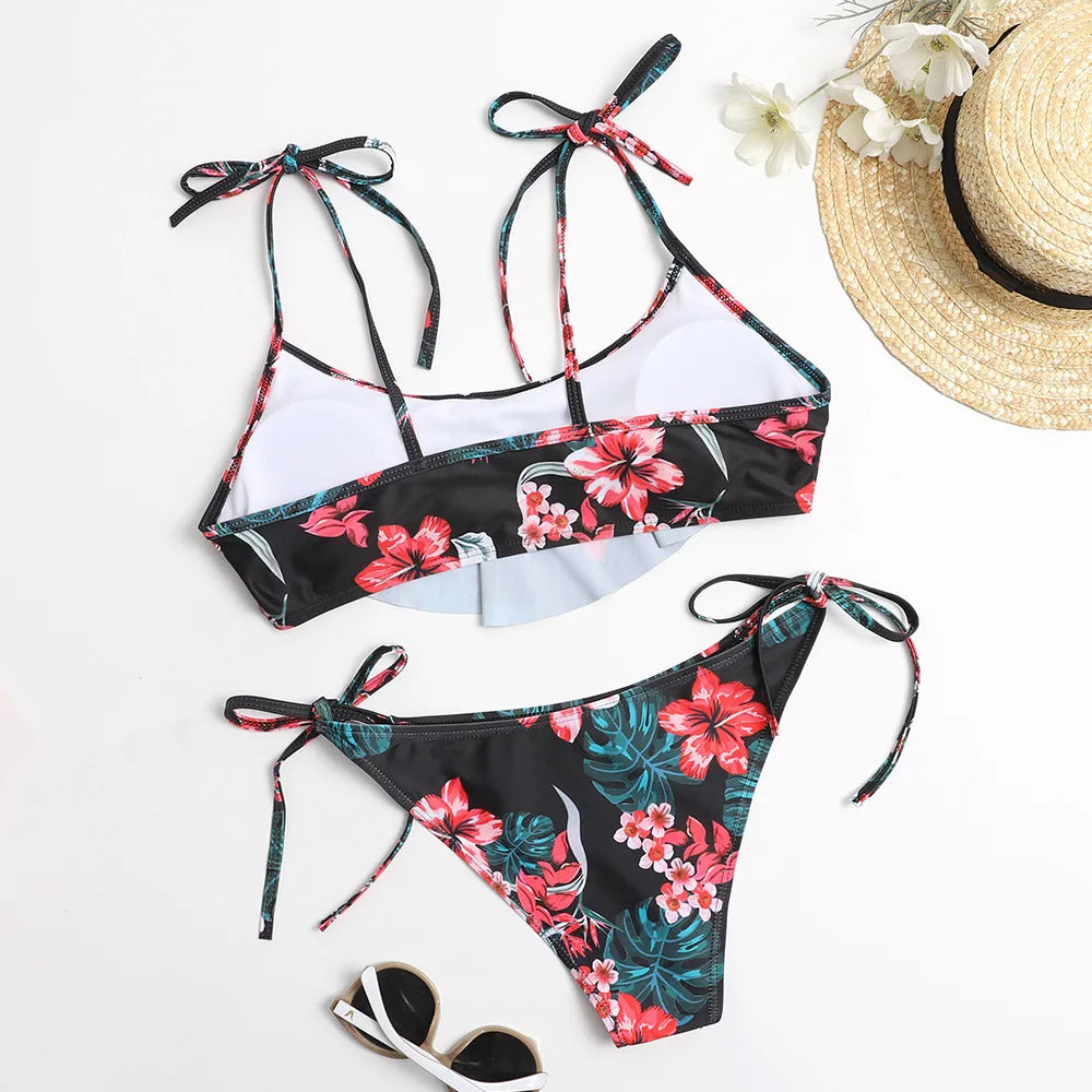 About: This Flounce Hibiscus Bikini Set is perfect for soaking up the sun! Featuring a flouncy boho bikini top with padded bust and self-tie criss-cross closure at the back. self-tie bottoms and polyester material.