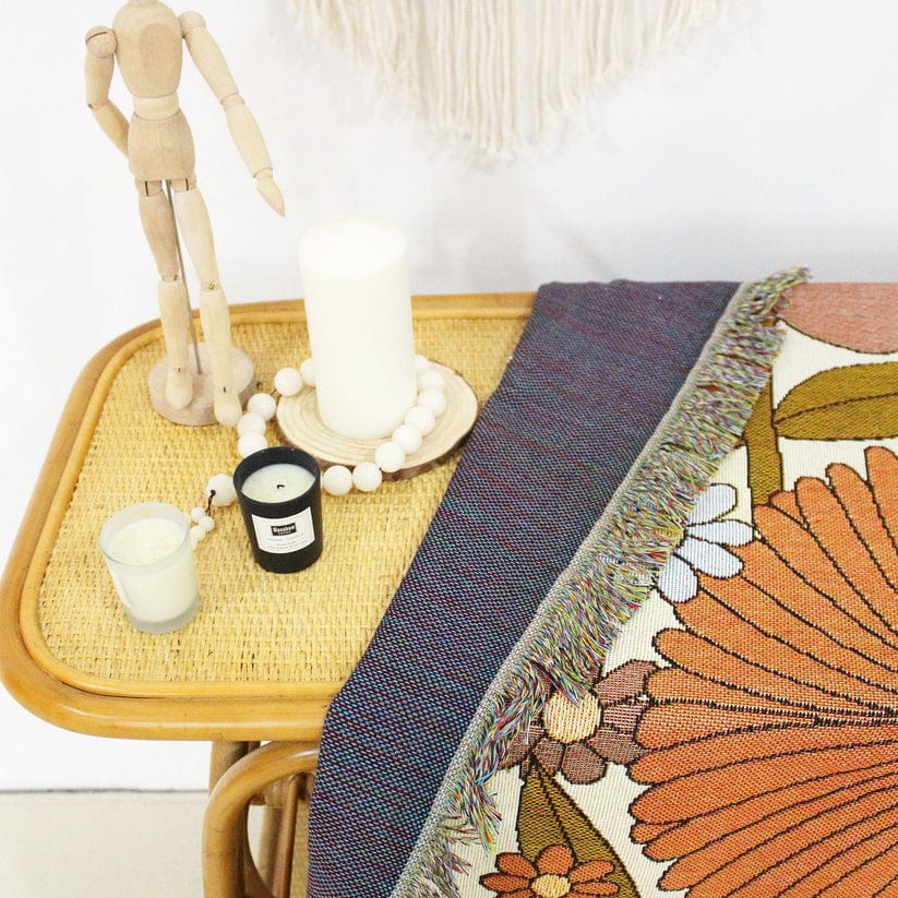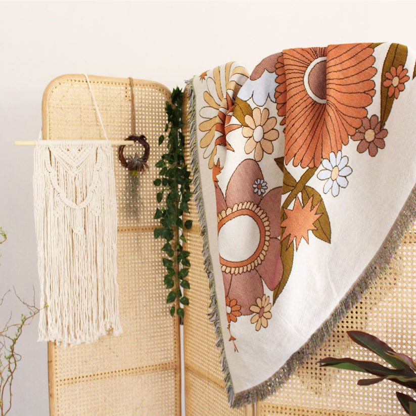 Bring flower power vibes to your bed with this woven throw blanket featuring groovy flower motifs. Finished with tasseled edges.