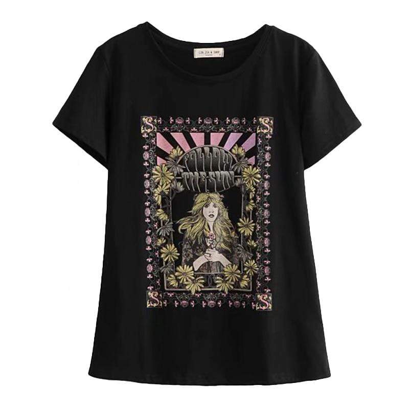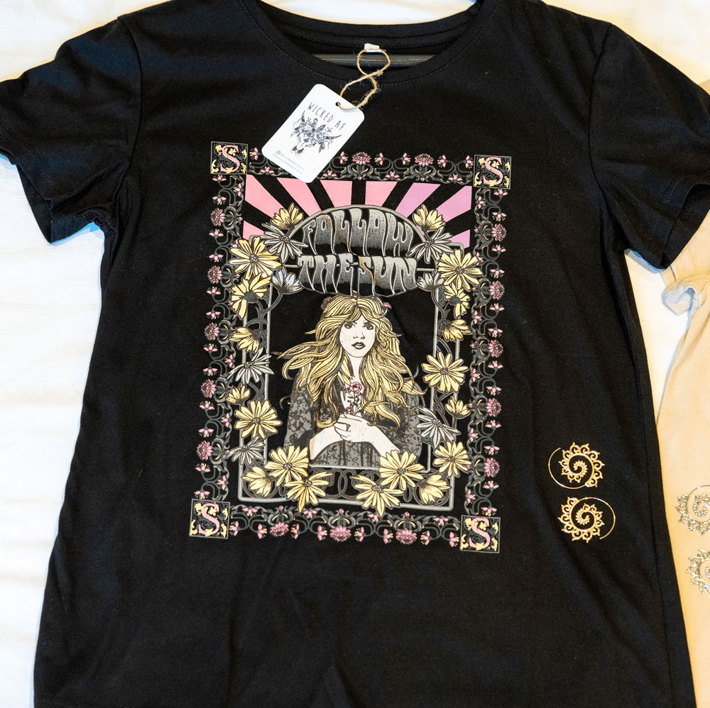 The Follow The Sun Tee is a sure wardrobe favorite for seasons to come! The tee comes in a distressed charcoal finish featuring a 70's inspired. hand drawn print.