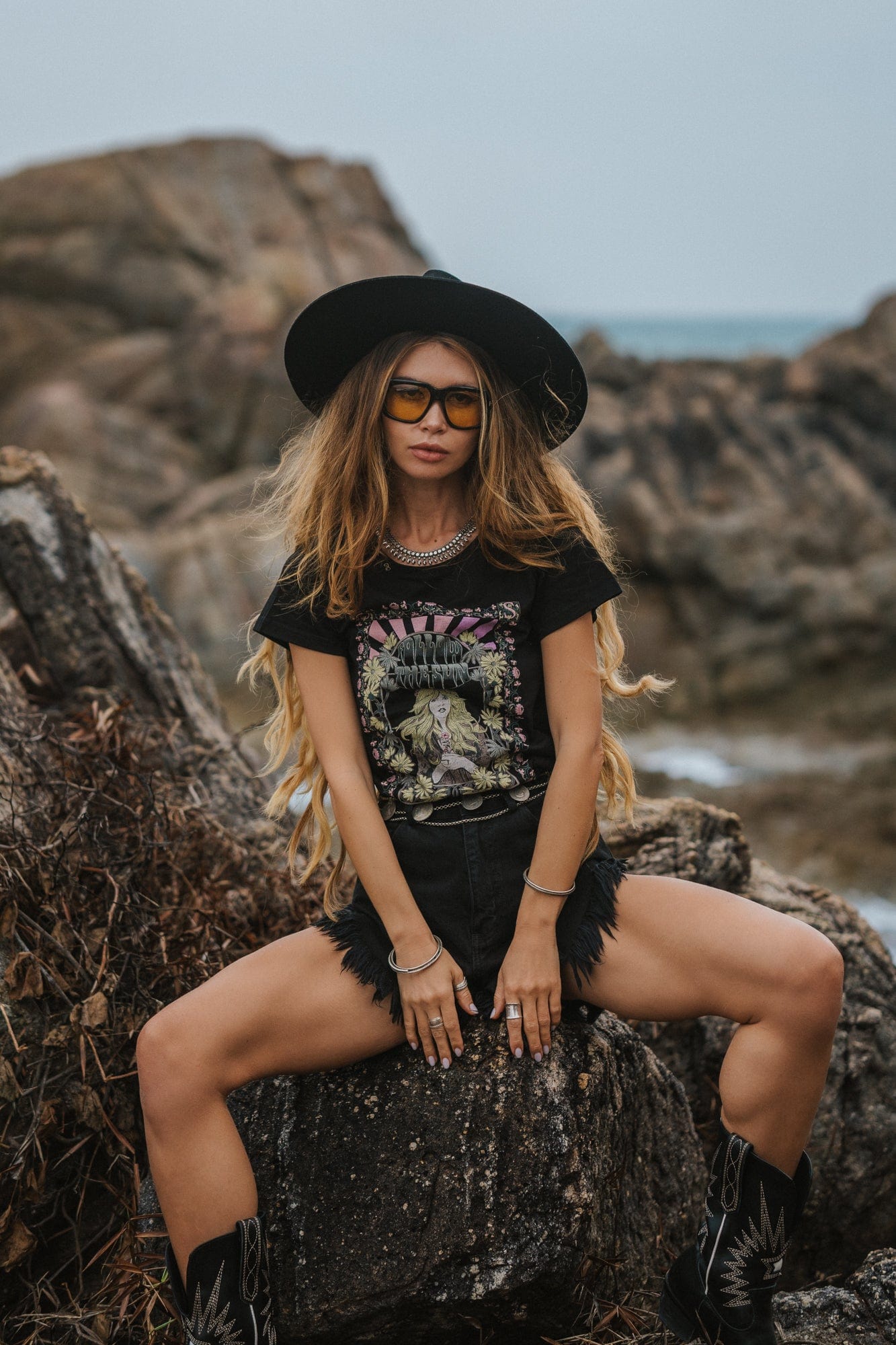 Wear this tee with your favorite jeans for casual down time or pair it with a stand out skirt for a cool and feminine bohemian look. Nothing beats the finishing touches of a pair of beat up boots. or a wide brimmed hat. or both. Make it yours!