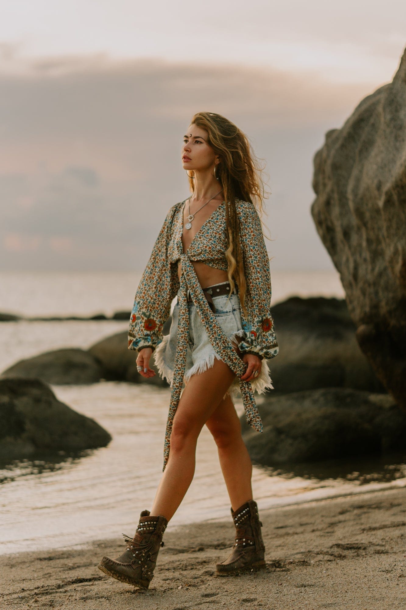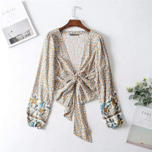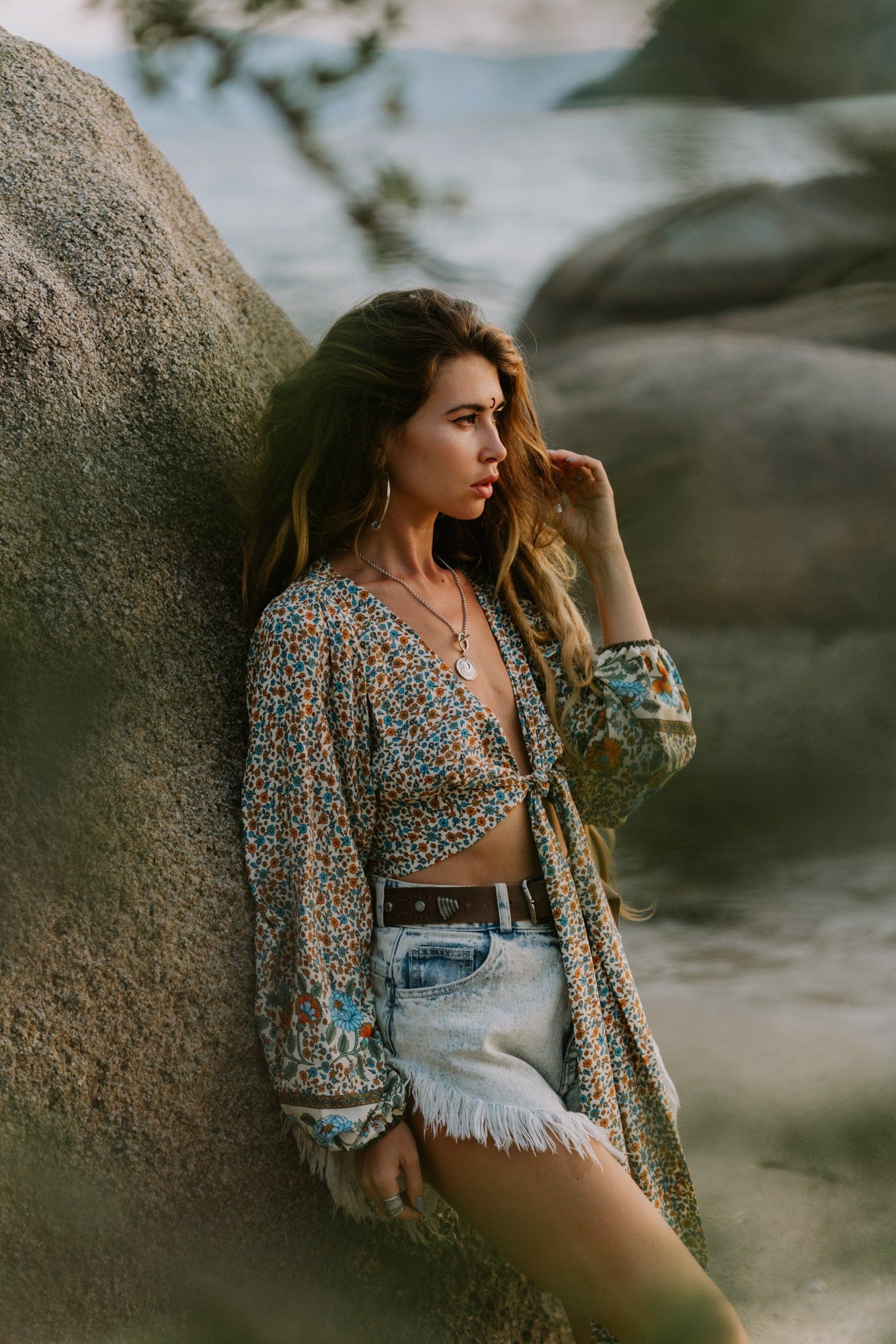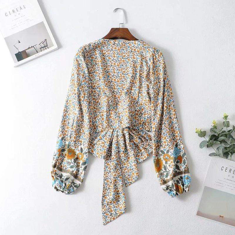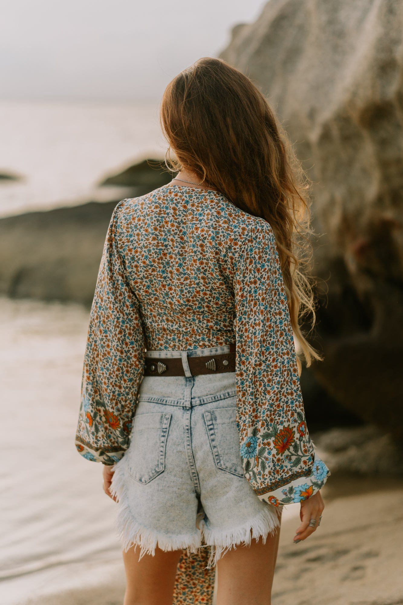 Add a boho touch to your look with our ruffle bell sleeve blouse. Freya is a Retro-inspired women's top. featuring a sexy V Neckline and cute bell sleeves.