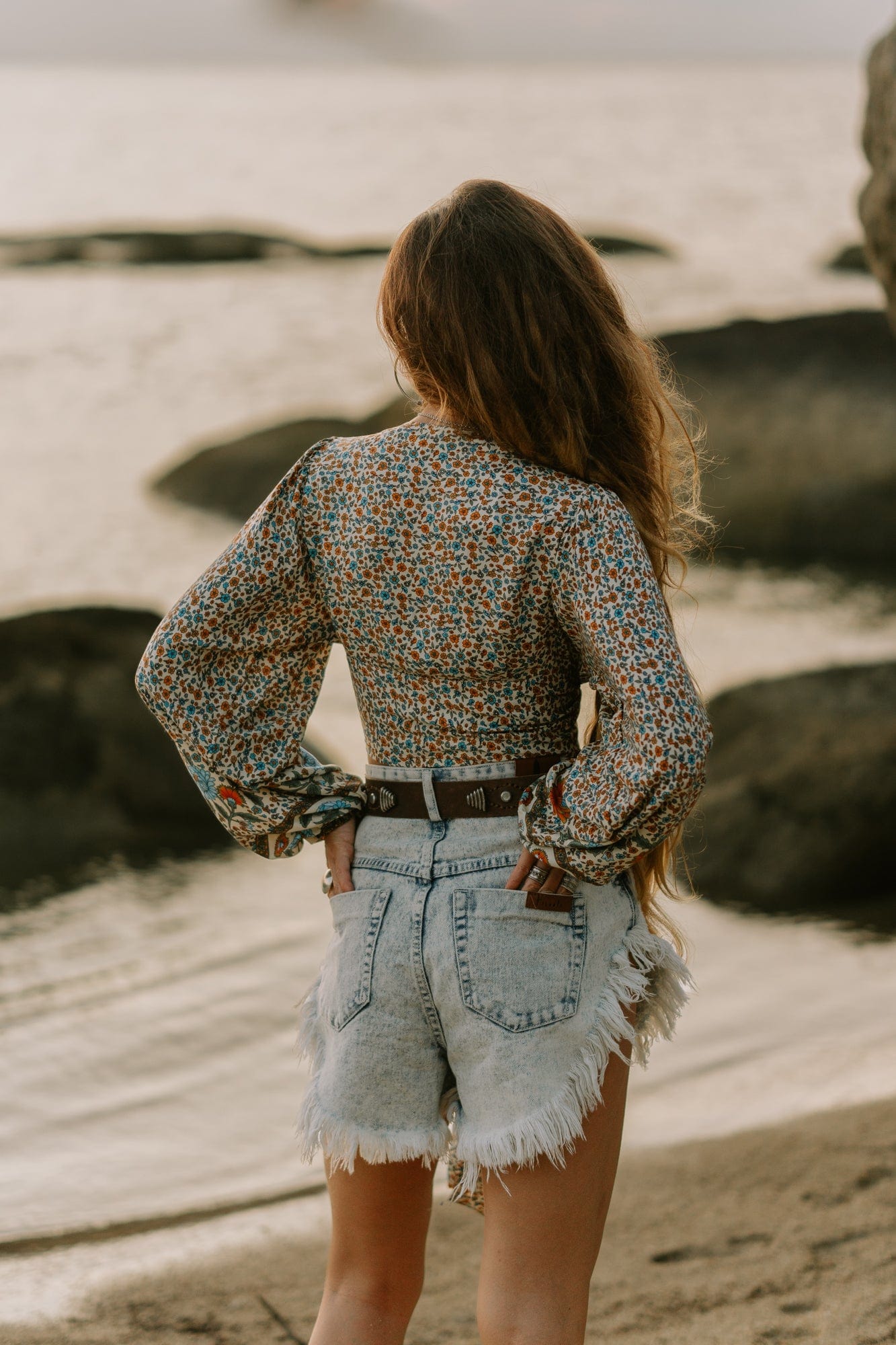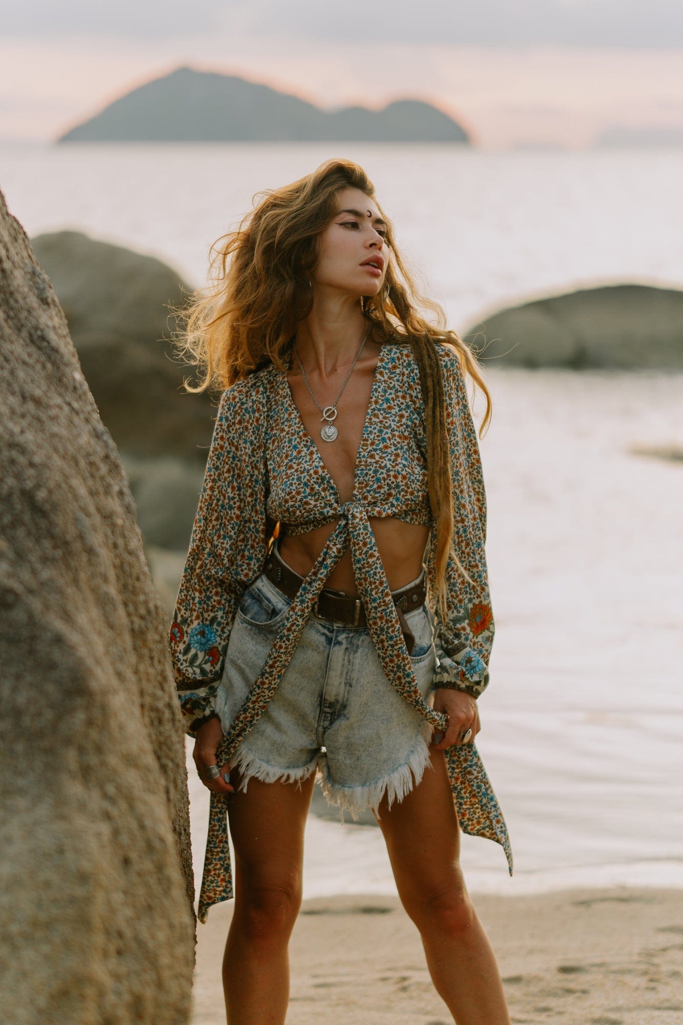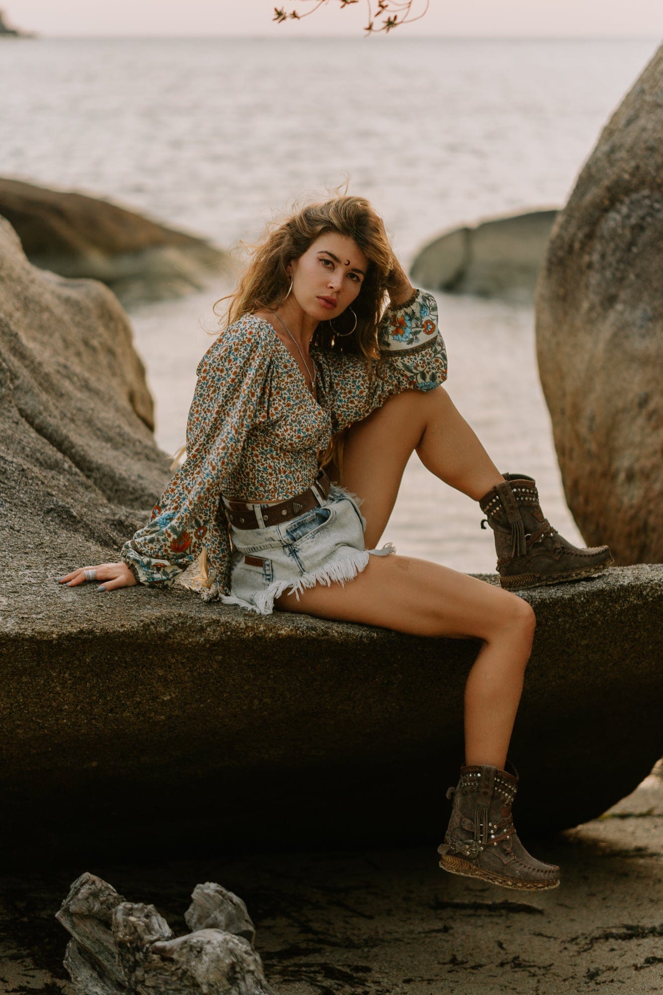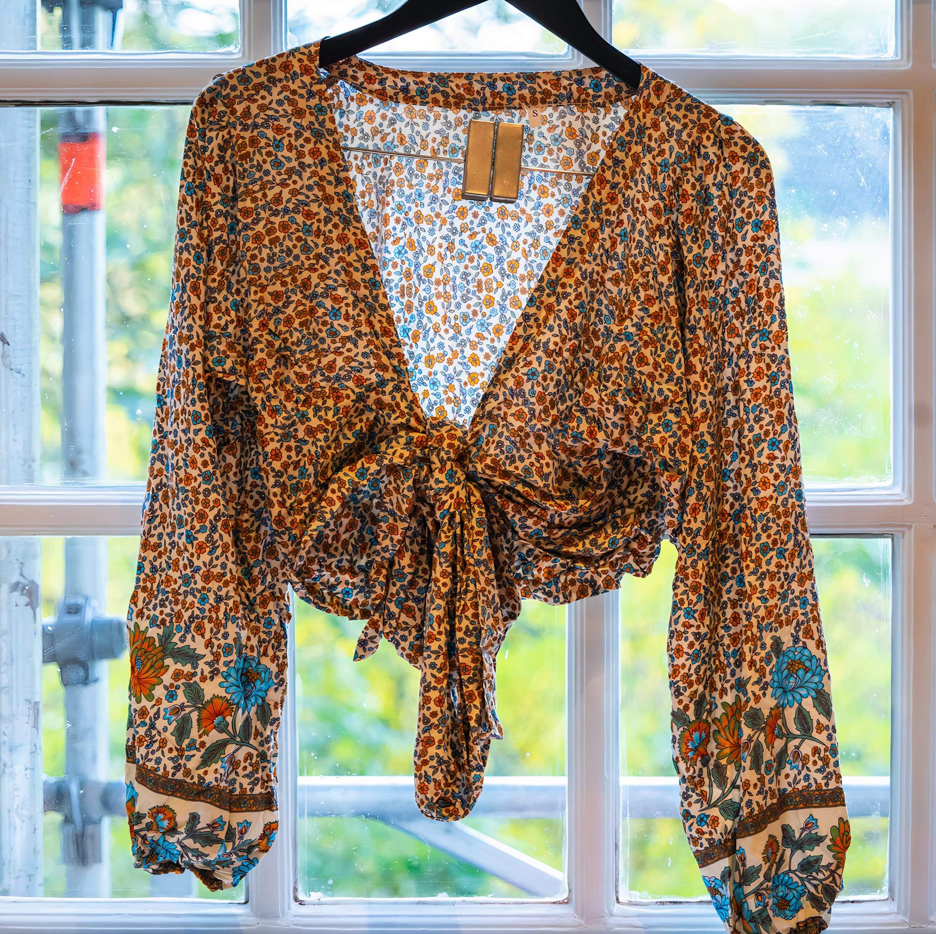 Add a boho touch to your look with our ruffle bell sleeve blouse. Freya is a Retro-inspired women's top. featuring a sexy V Neckline and cute bell sleeves.