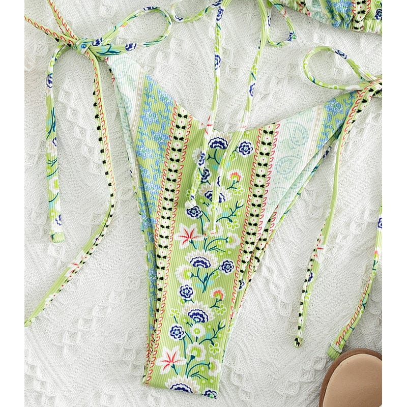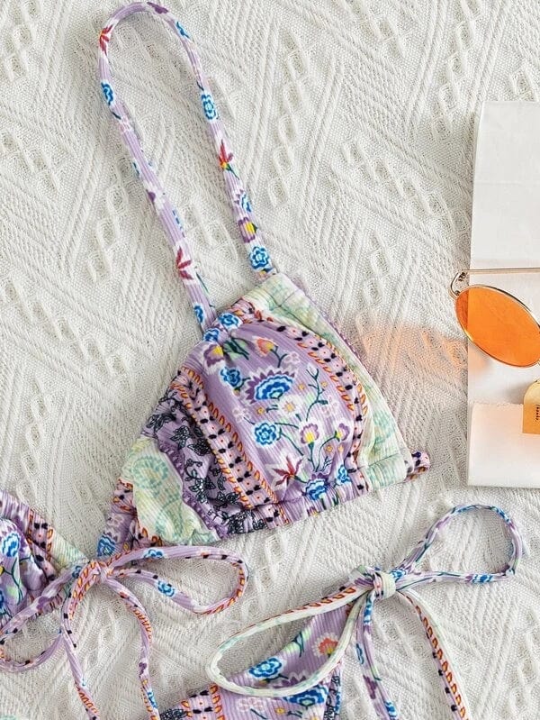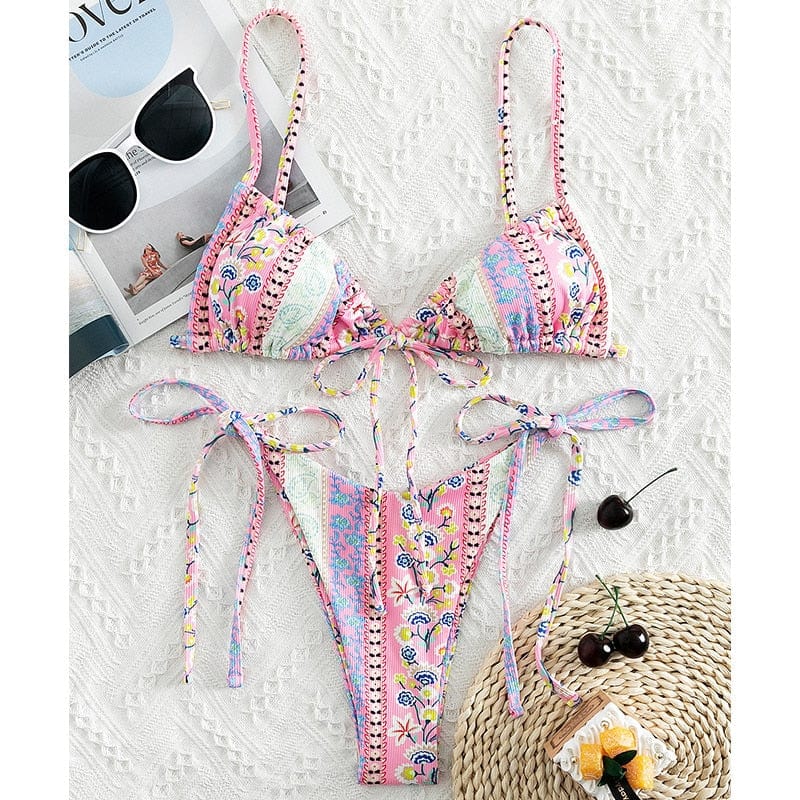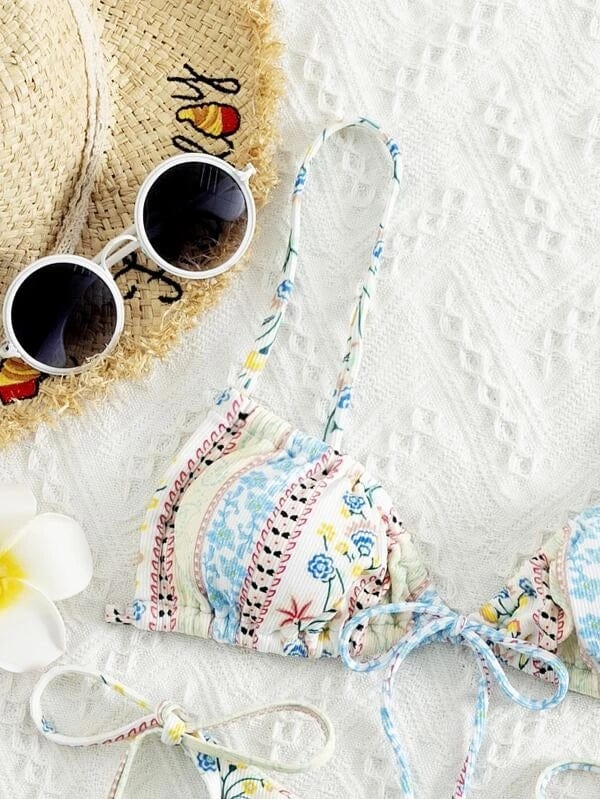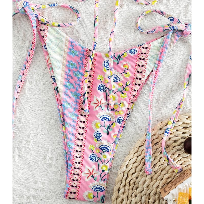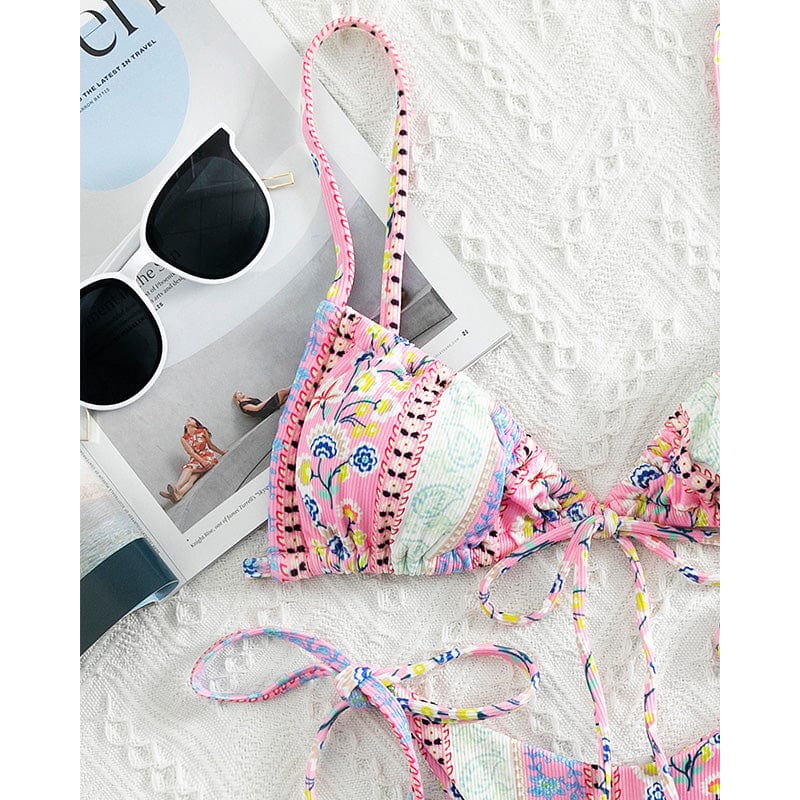 Our Gaia Bikini Set in spring-inspired pastel floral designs is the perfect staple item in your bikini wardrobe! Gaia Bikini Set features a beautiful ribbed textured fabric triangle bikini bodice with ultra-thin straps that tie around the neck and back to give you a beautiful fit. One of our favorite triangle bikinis is because of its adjustability. versatility. and flattering shape.
