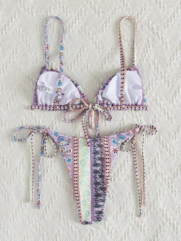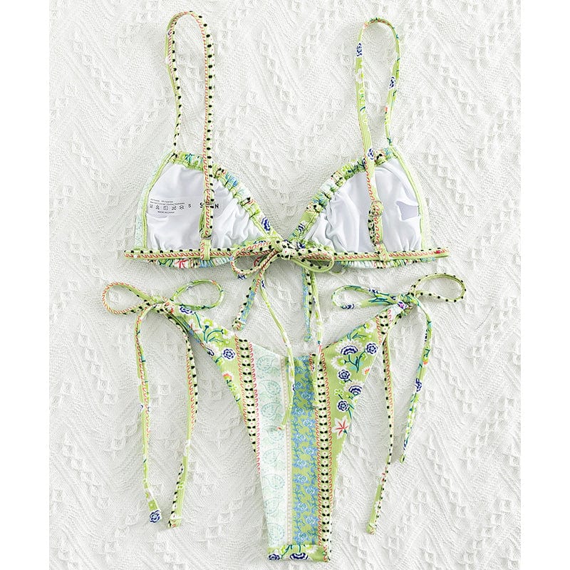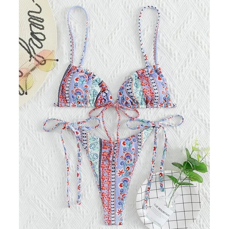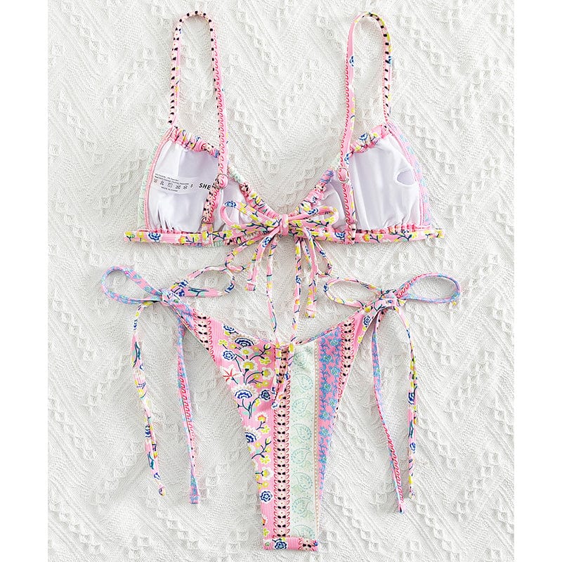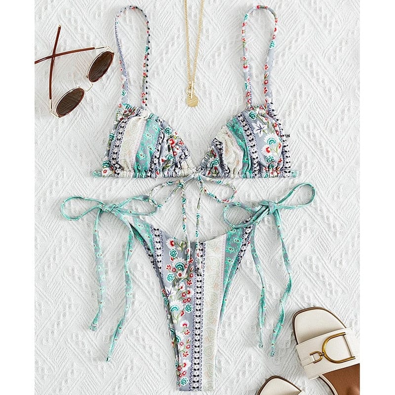 Our Gaia Bikini Set in spring-inspired pastel floral designs is the perfect staple item in your bikini wardrobe! Gaia Bikini Set features a beautiful ribbed textured fabric triangle bikini bodice with ultra-thin straps that tie around the neck and back to give you a beautiful fit. One of our favorite triangle bikinis is because of its adjustability. versatility. and flattering shape.