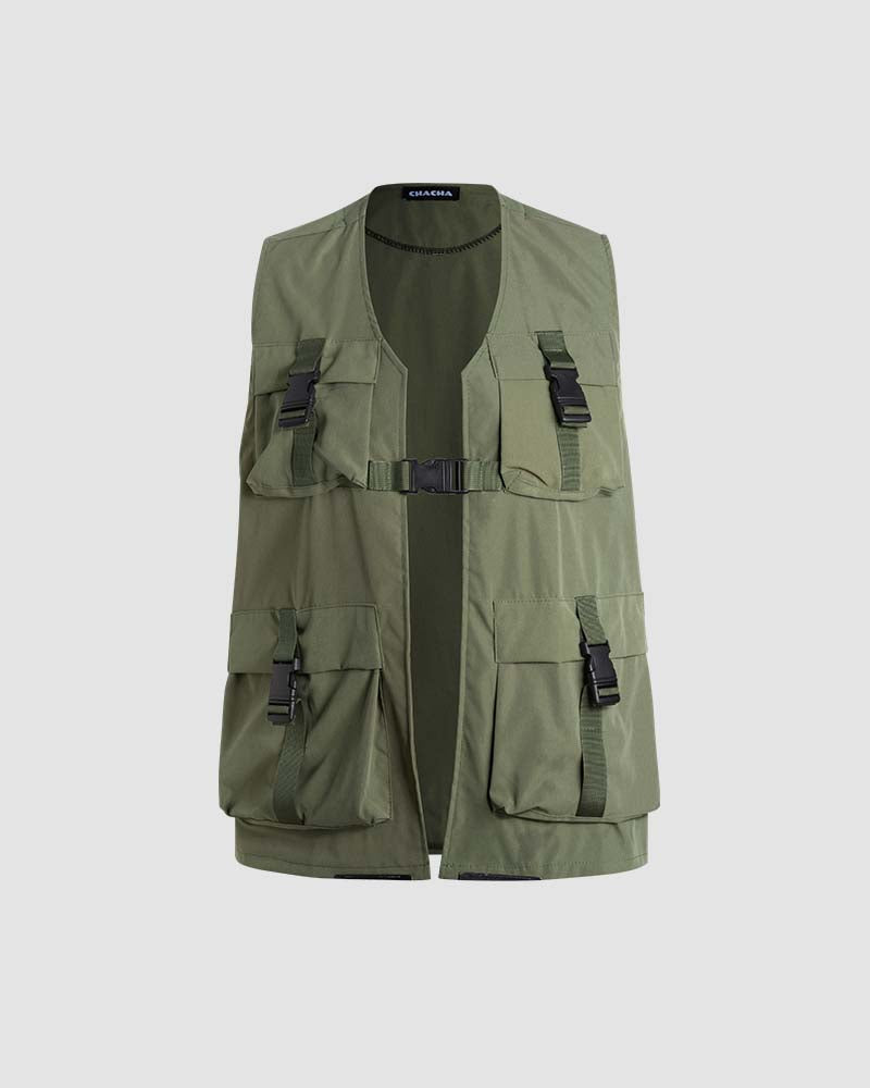 Details: Utility vest with front belt and pocket design